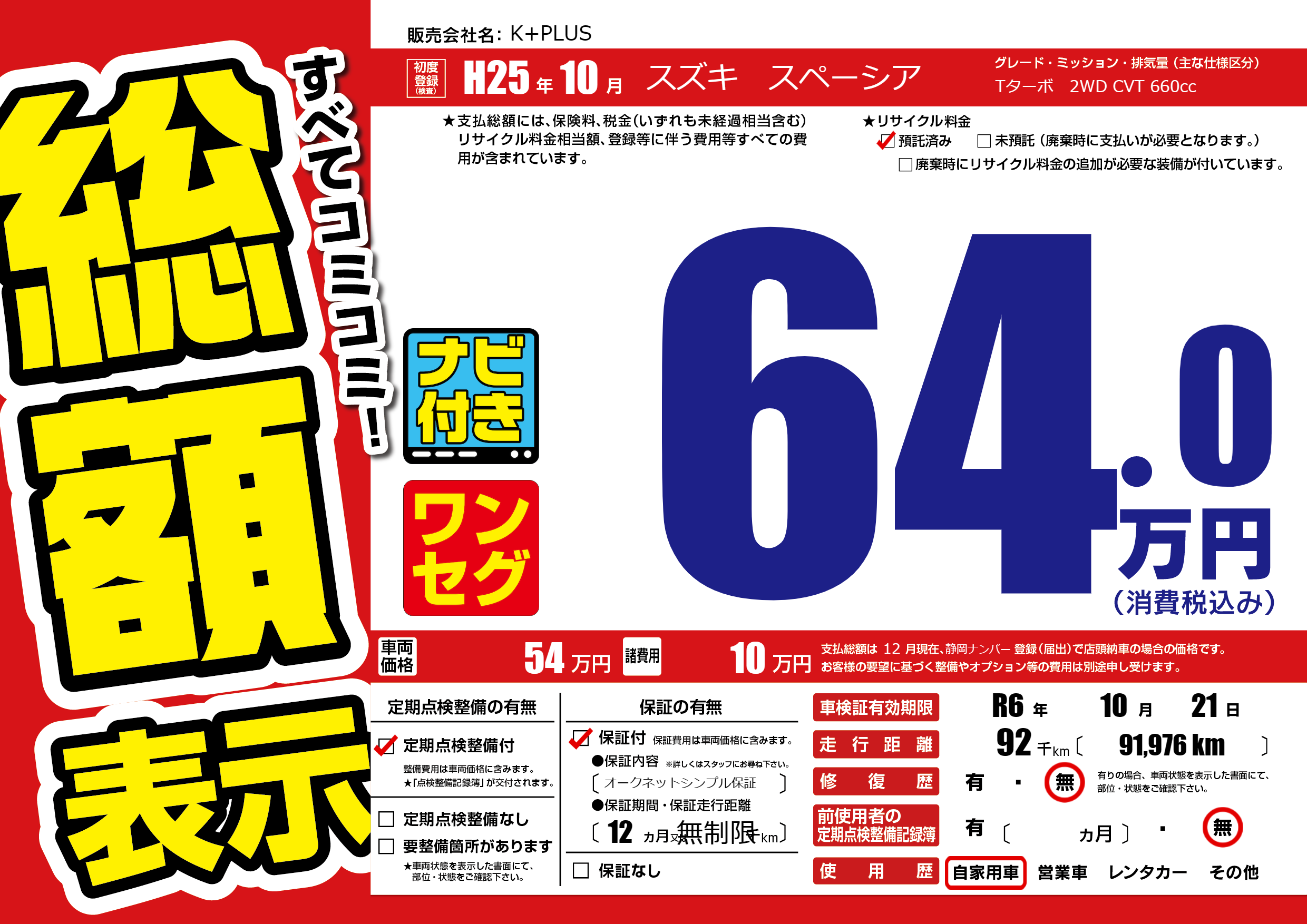 | 車名 | スズキ スペーシア | グレード ミッション 排気量 |