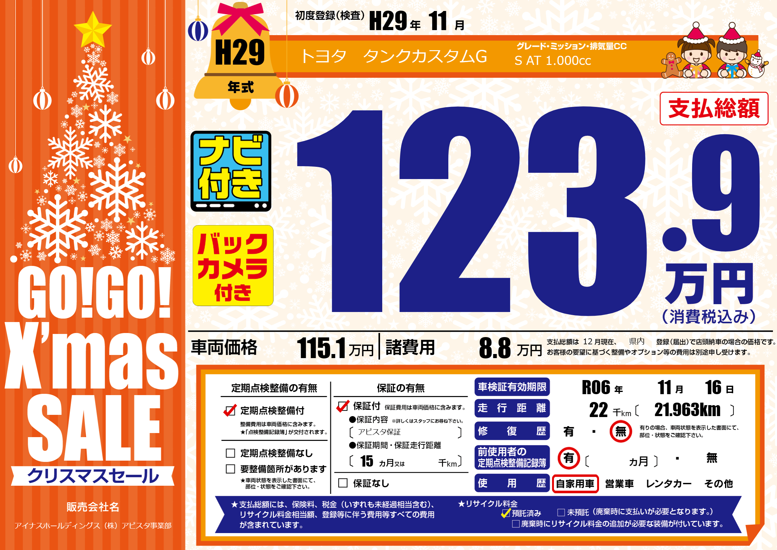 | 車名 | トヨタ タンクカスタムG | グレード ミッション 排気量 |