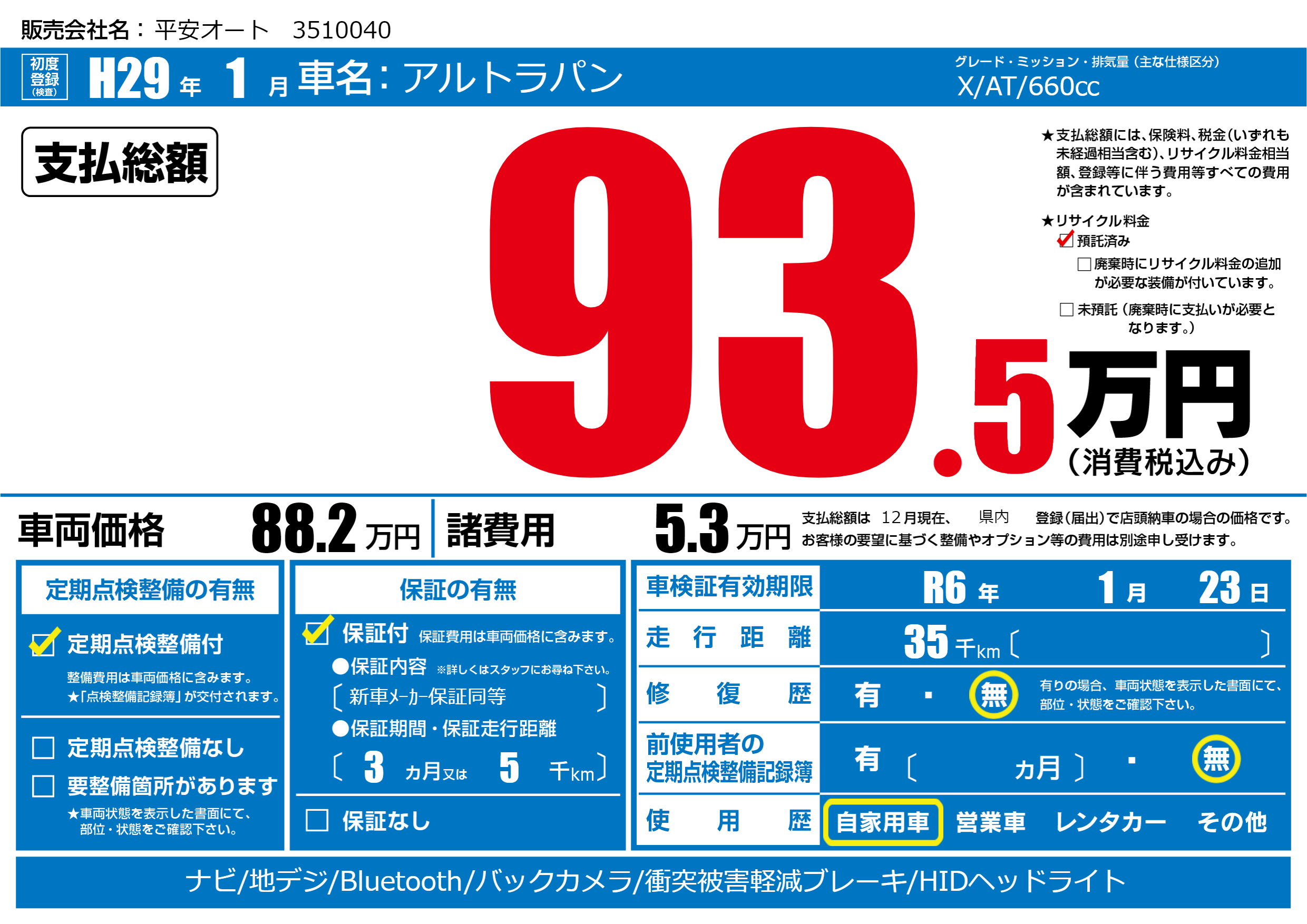 なし | 車検制限 | R6年1月23月 |