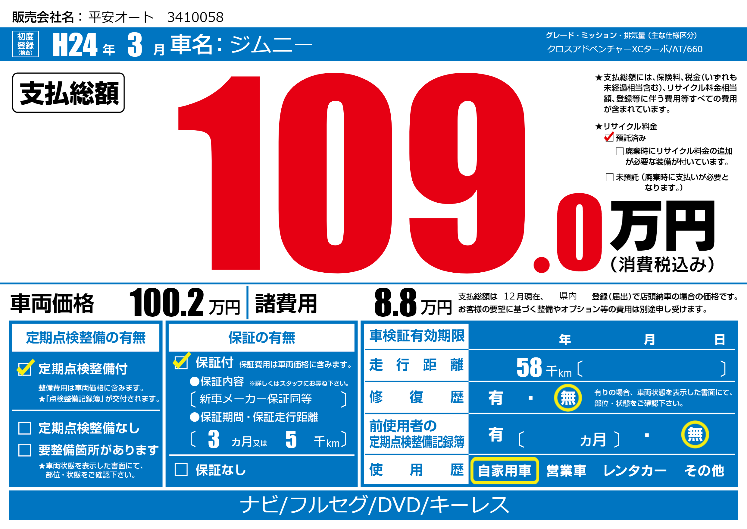 | 車名 | ジムニー | グレード ミッション 排気量 |