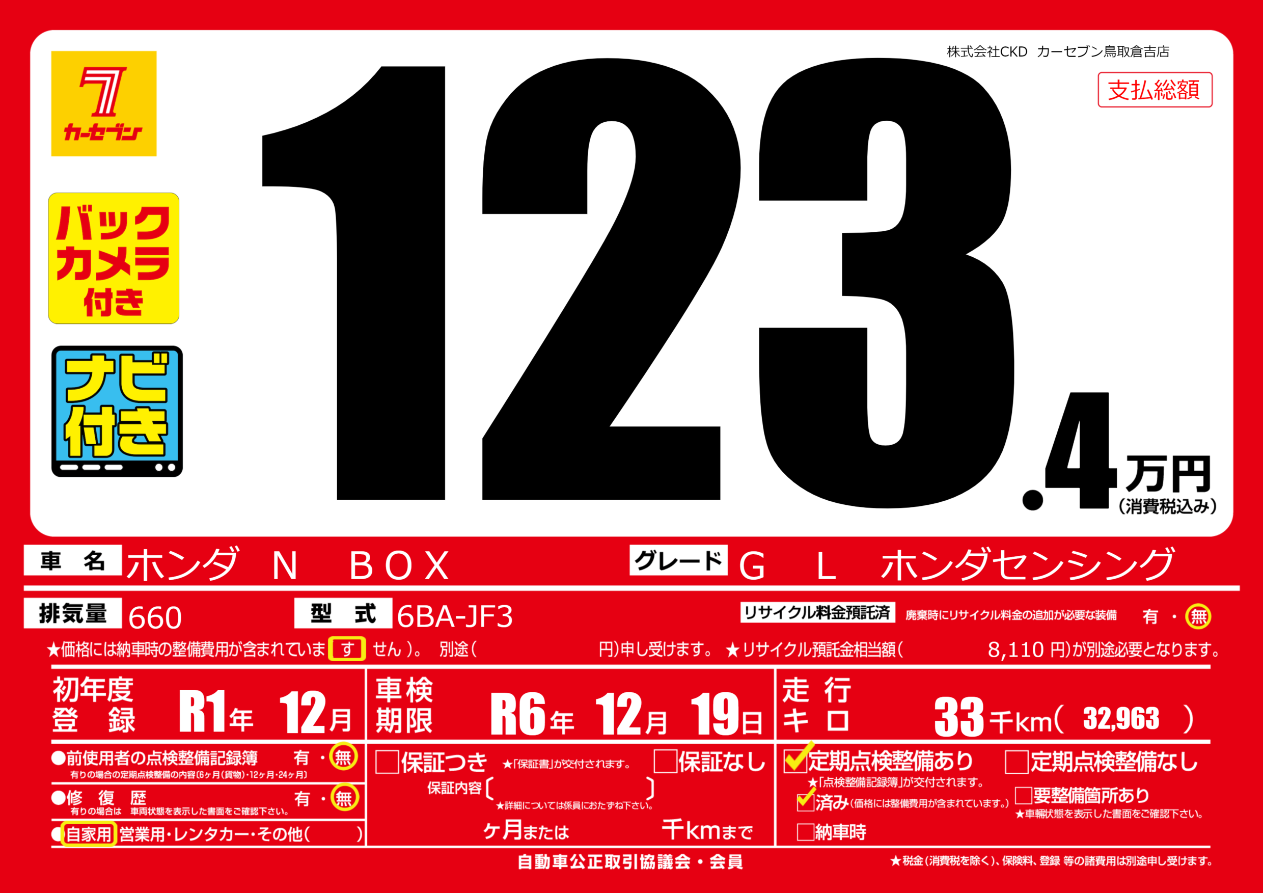 | 定期点検整備 | 定期点検整備あり 定期点検整備済み | ||