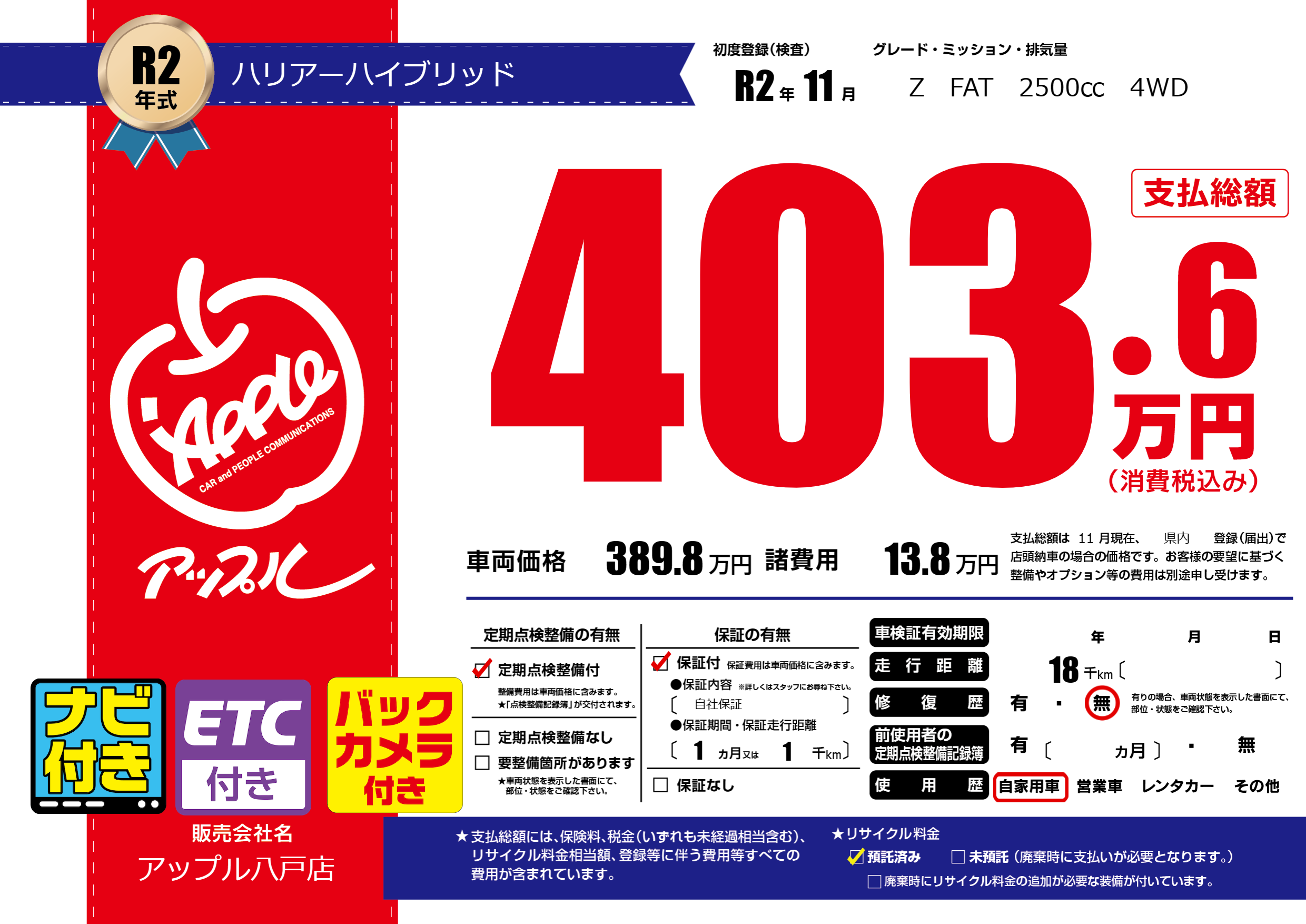 保証付き 保証内容( 自社保証) 1ヶ月または(1)千kmまで |