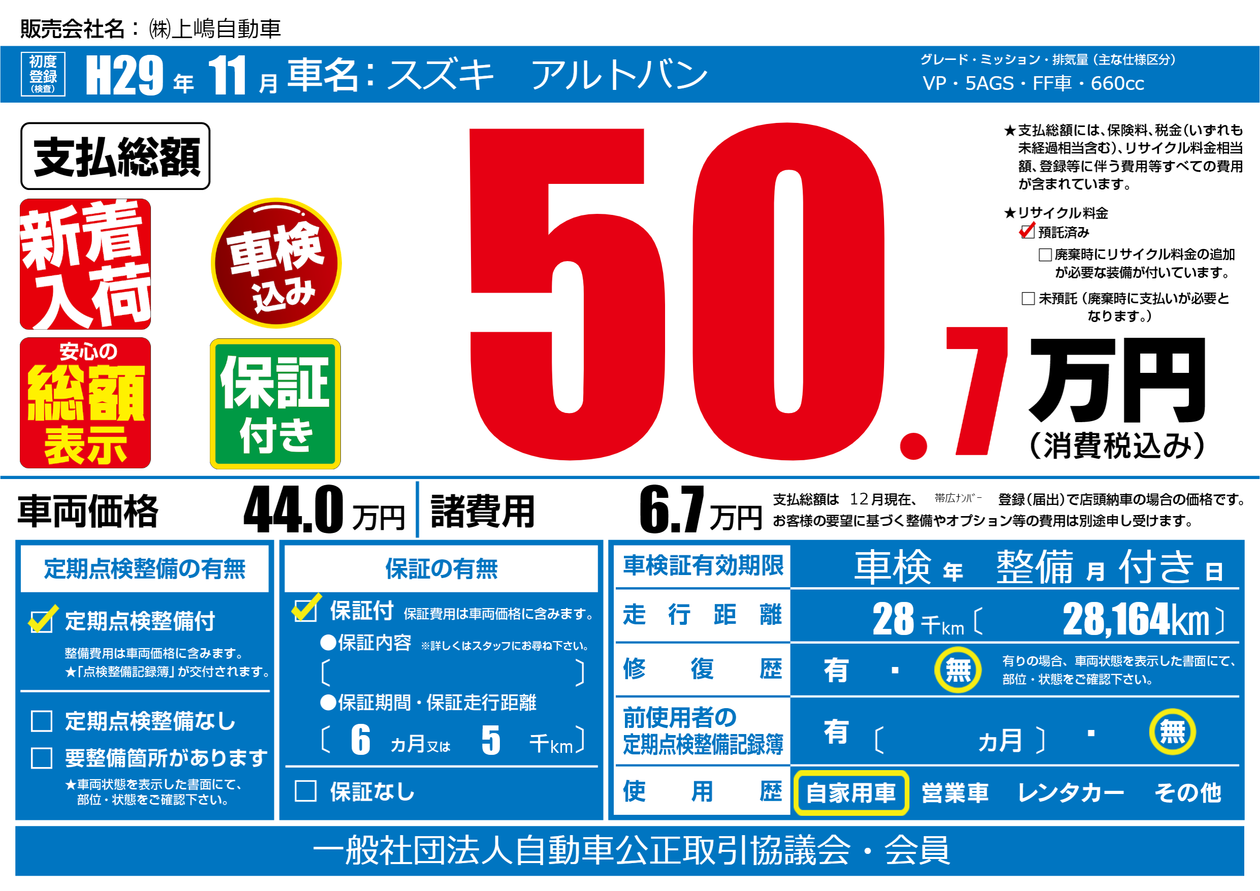 保証付き 保証内容(---) 6ヶ月または(5)千kmまで |