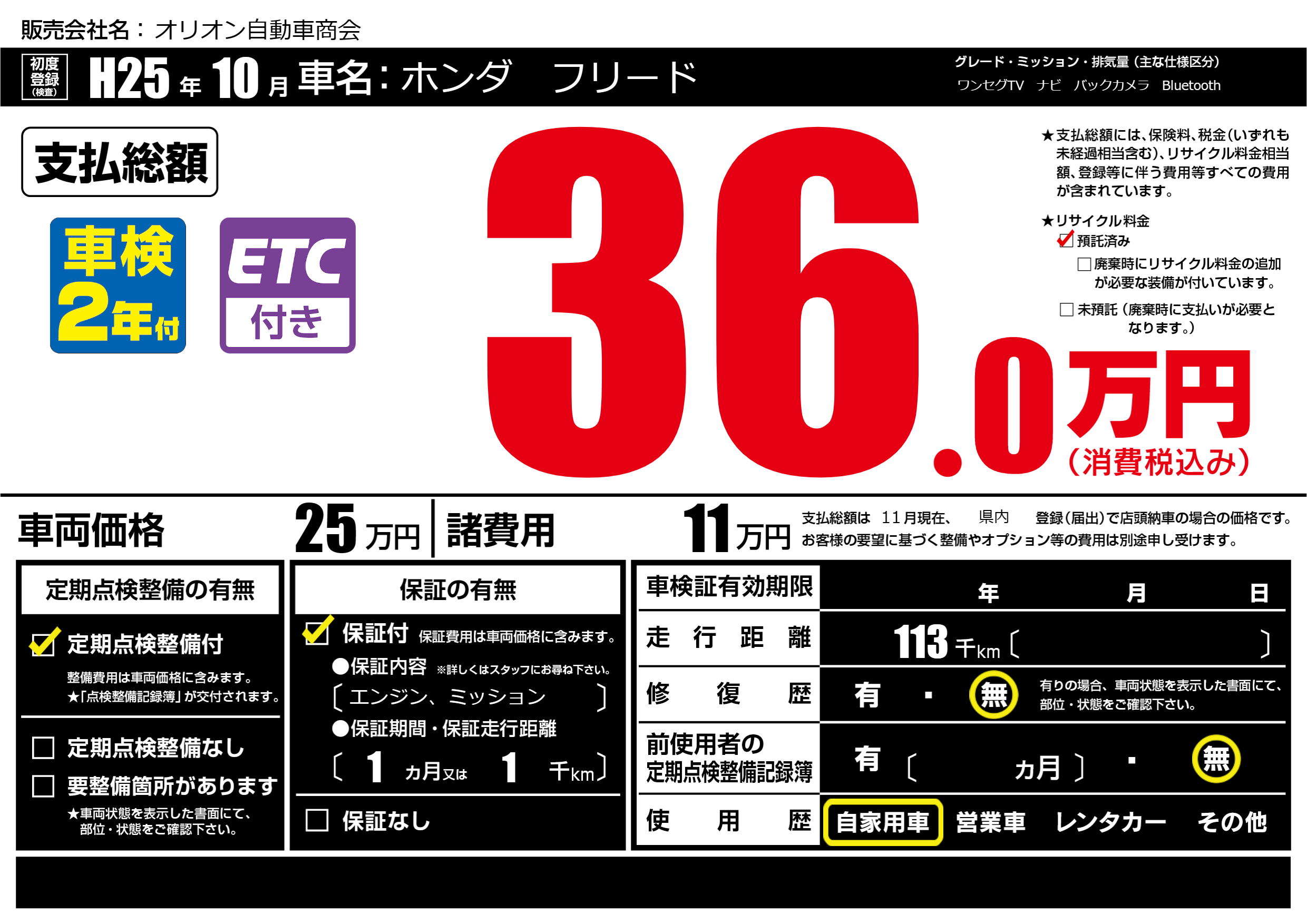 | 走行キロ | 11.3万km | 初年度登録 | H25年10月 |