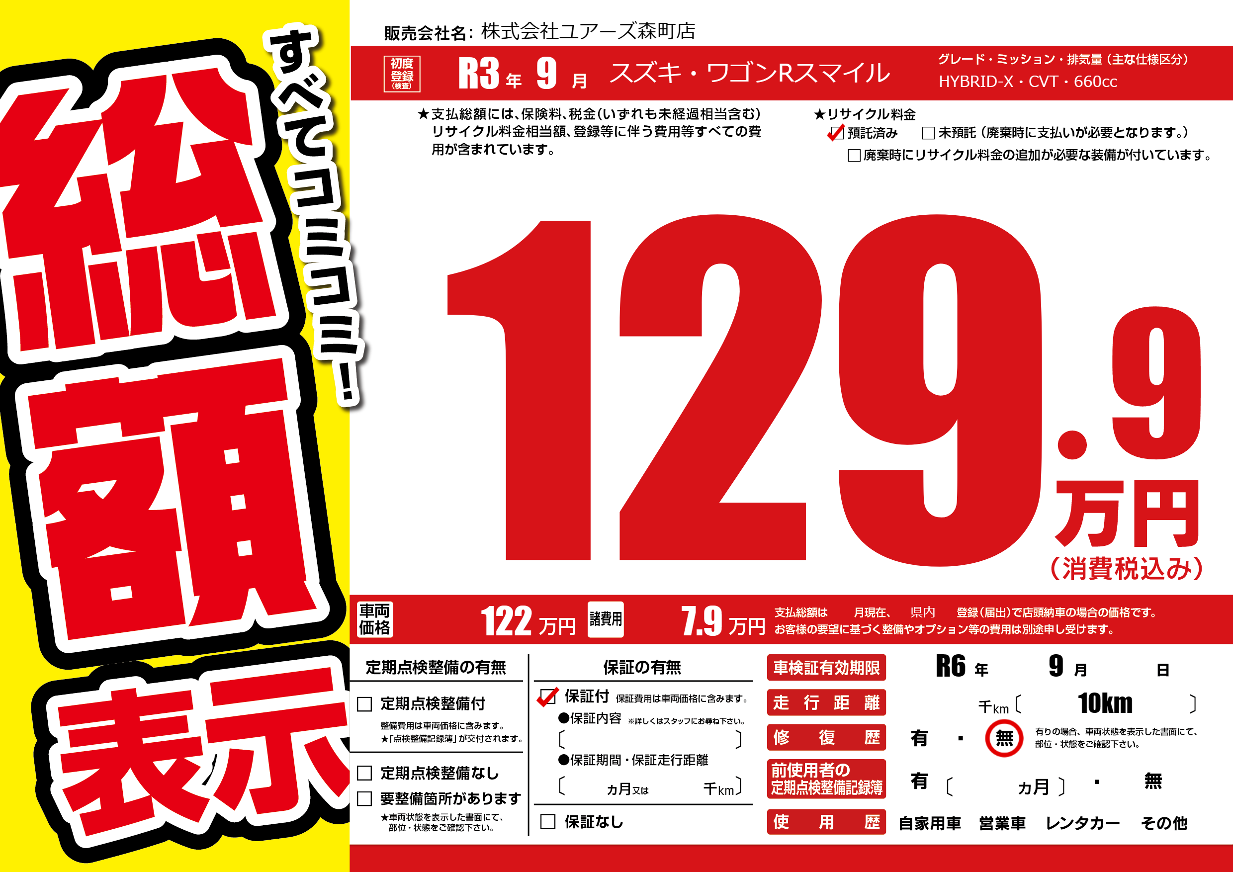 | 車名 | スズキ・ワゴンRスマイル | グレード ミッション 排気量 |