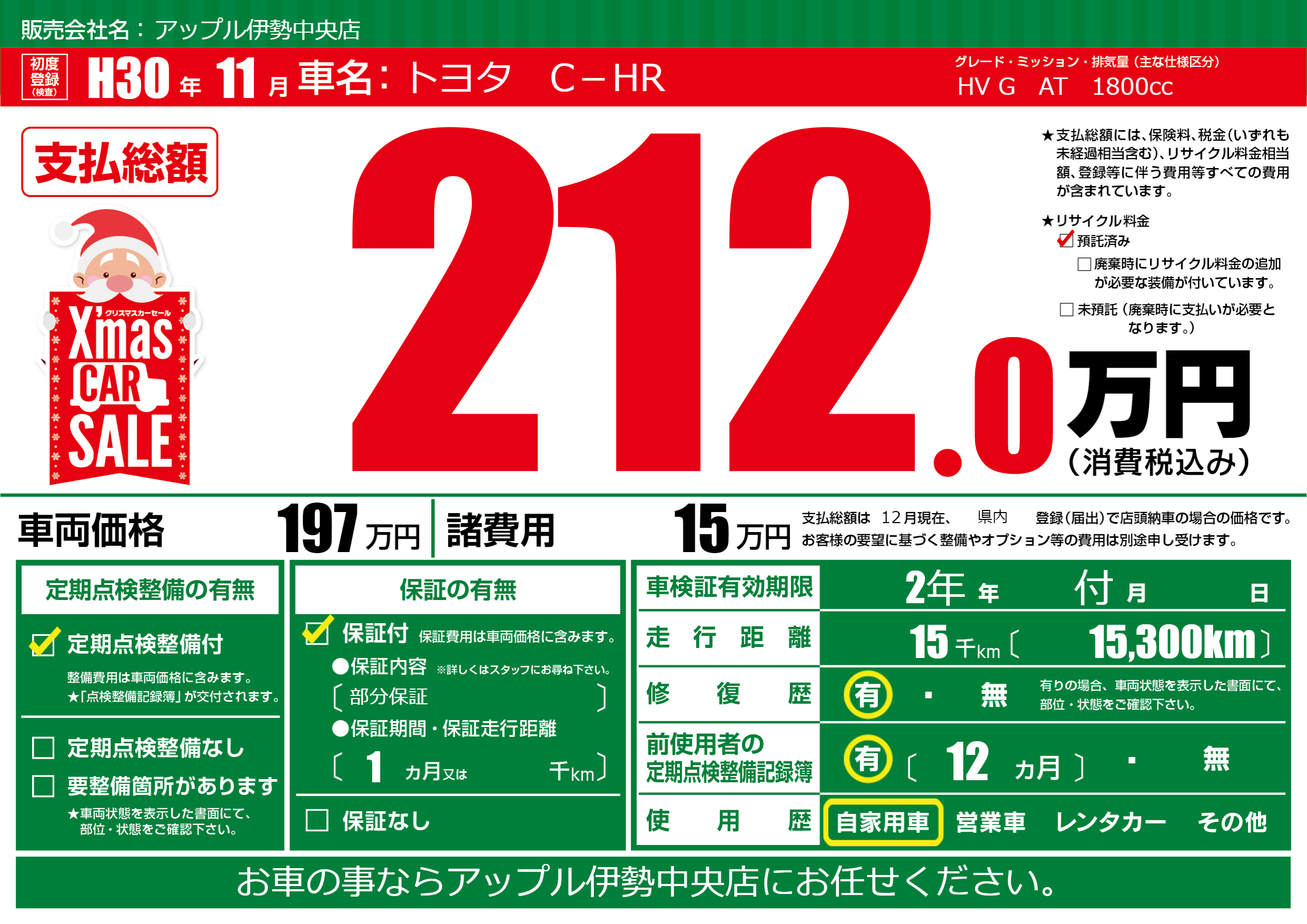 | 走行キロ | 1.5万km | 初年度登録 | H30年11月 |