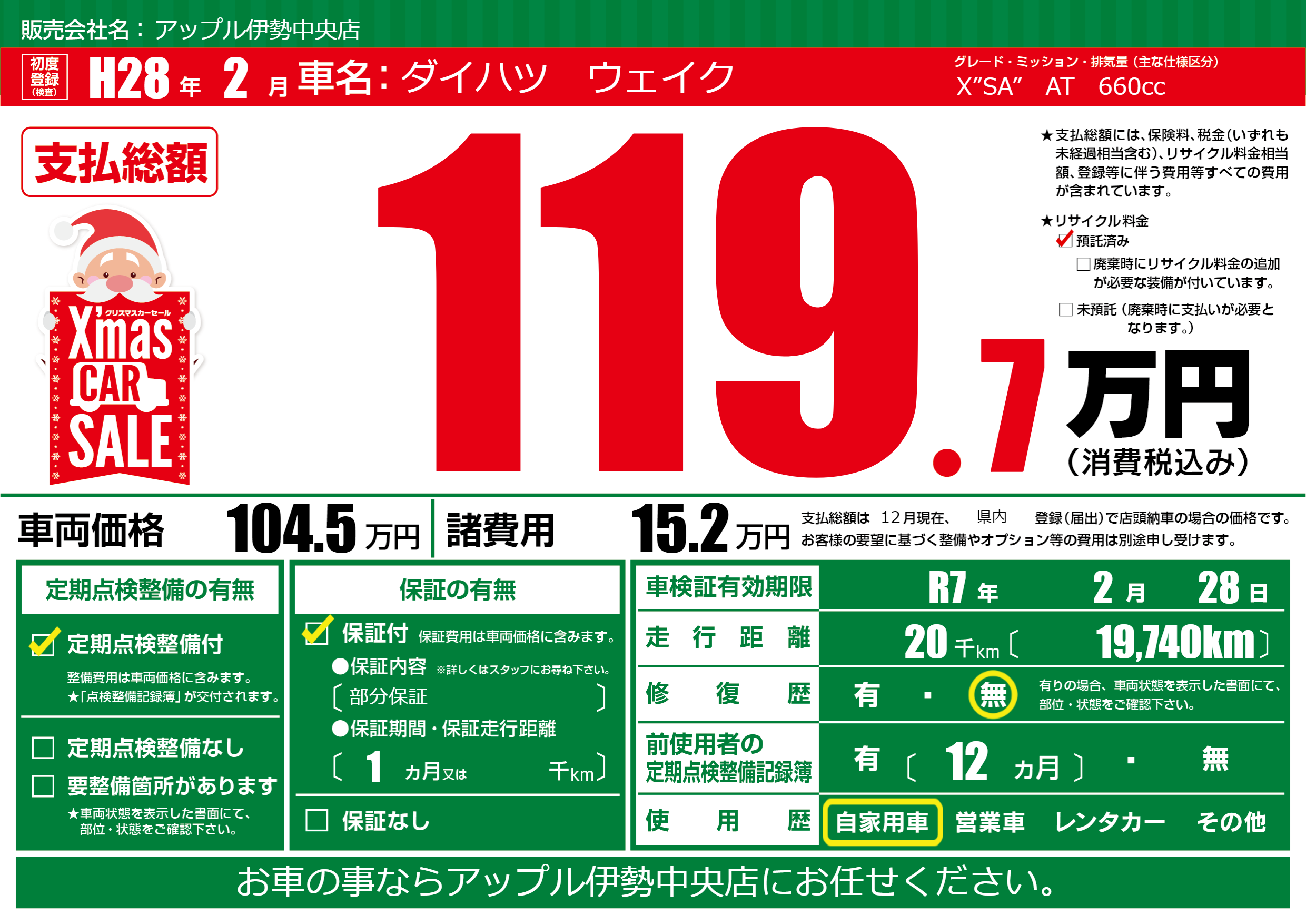 | 車名 | ダイハツ ウェイク | グレード ミッション 排気量 |