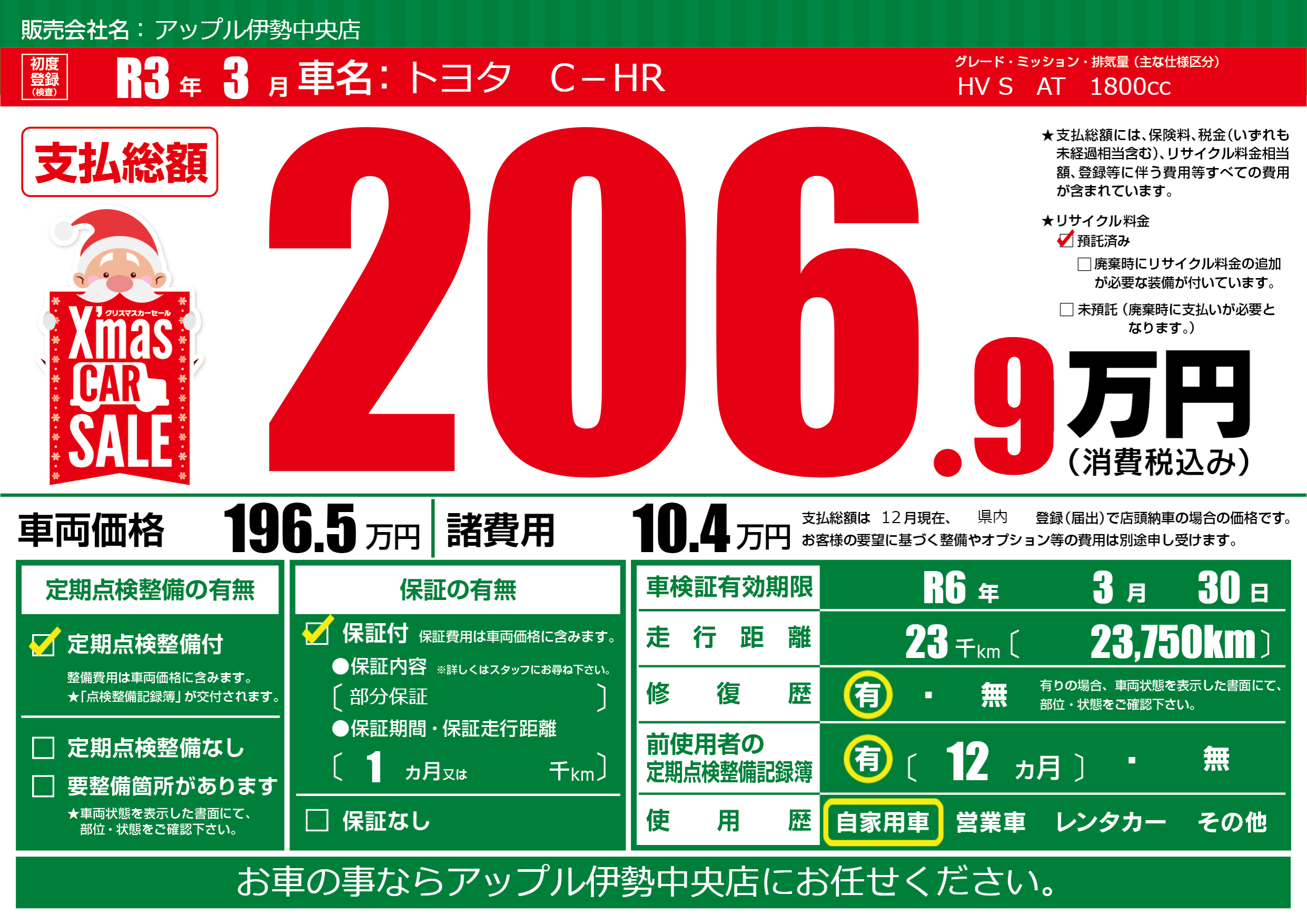 | 車名 | トヨタ C-HR | グレード ミッション 排気量 |