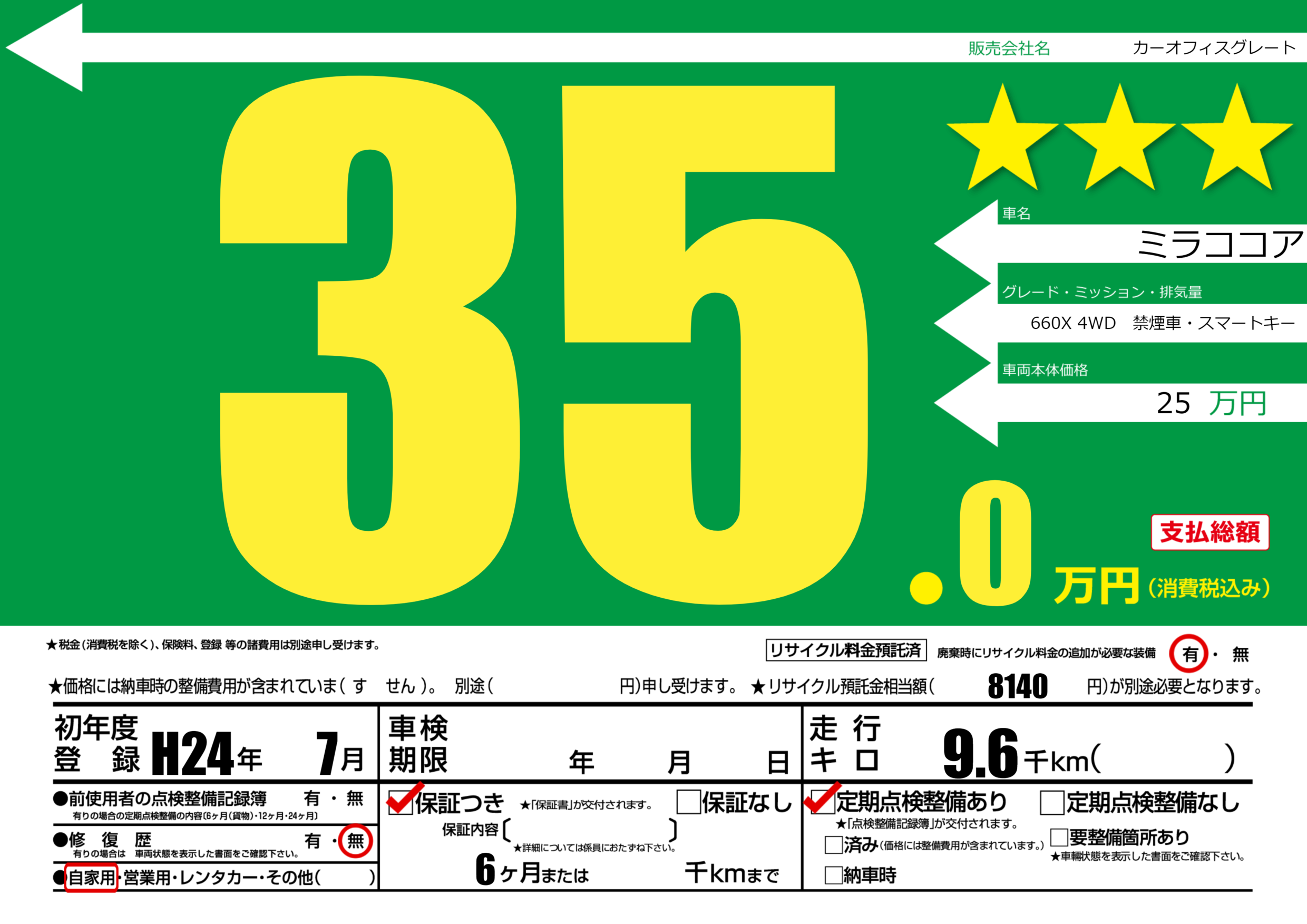 保証付き 保証内容(---) 6ヶ月または()千kmまで |