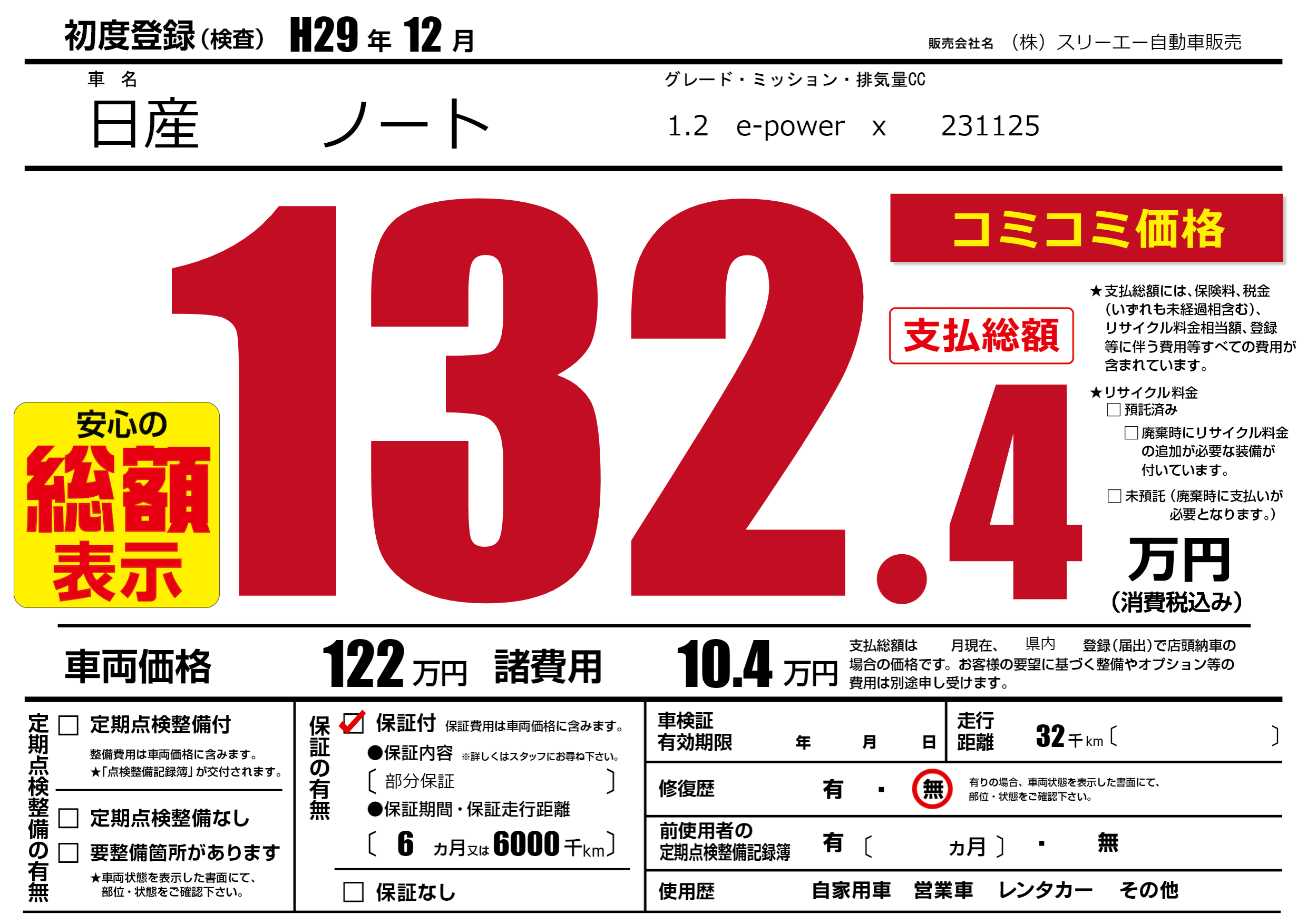 保証付き 保証内容(部分保証) 6ヶ月または(6000)千kmまで |