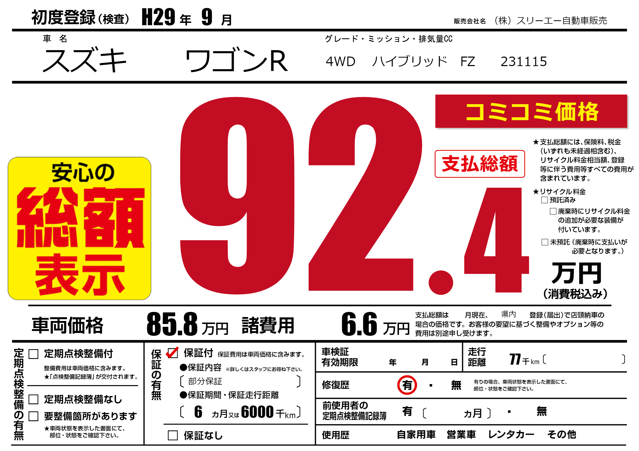 | 車名 | スズキ ワゴンR | グレード ミッション 排気量 |