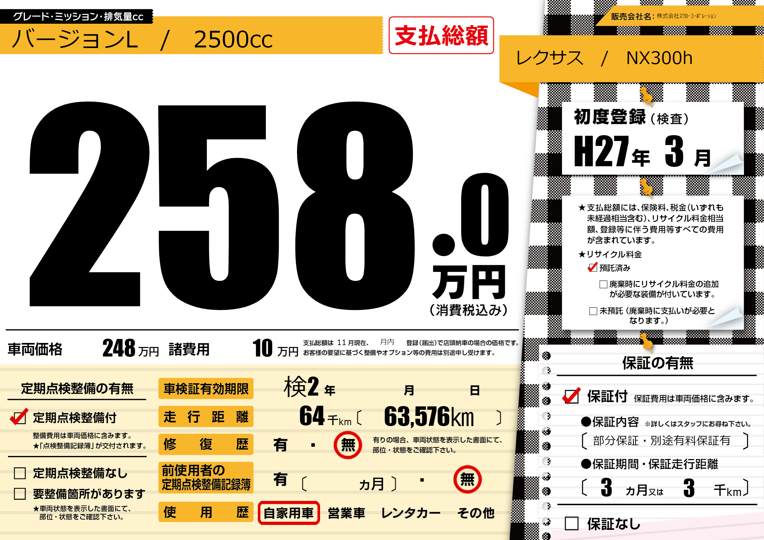 | 車名 | レクサス / NX300h | グレード ミッション 排気量 |