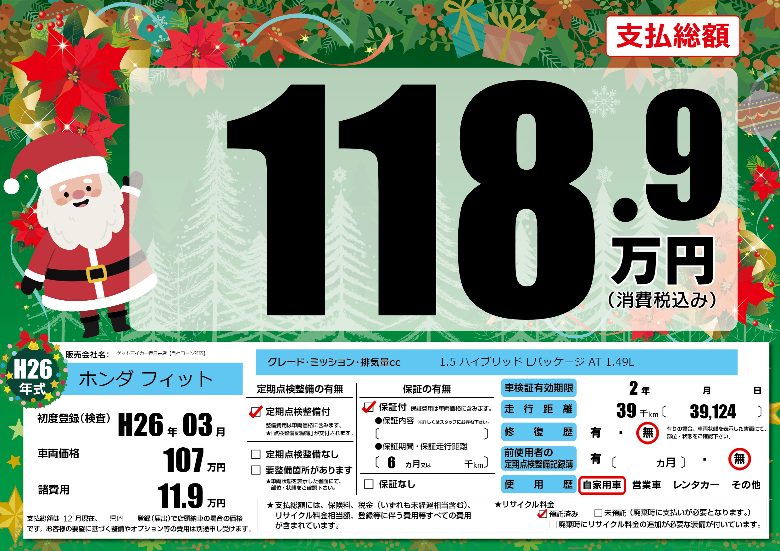 | 走行キロ | 3.9万km | 初年度登録 | H26年03月 |