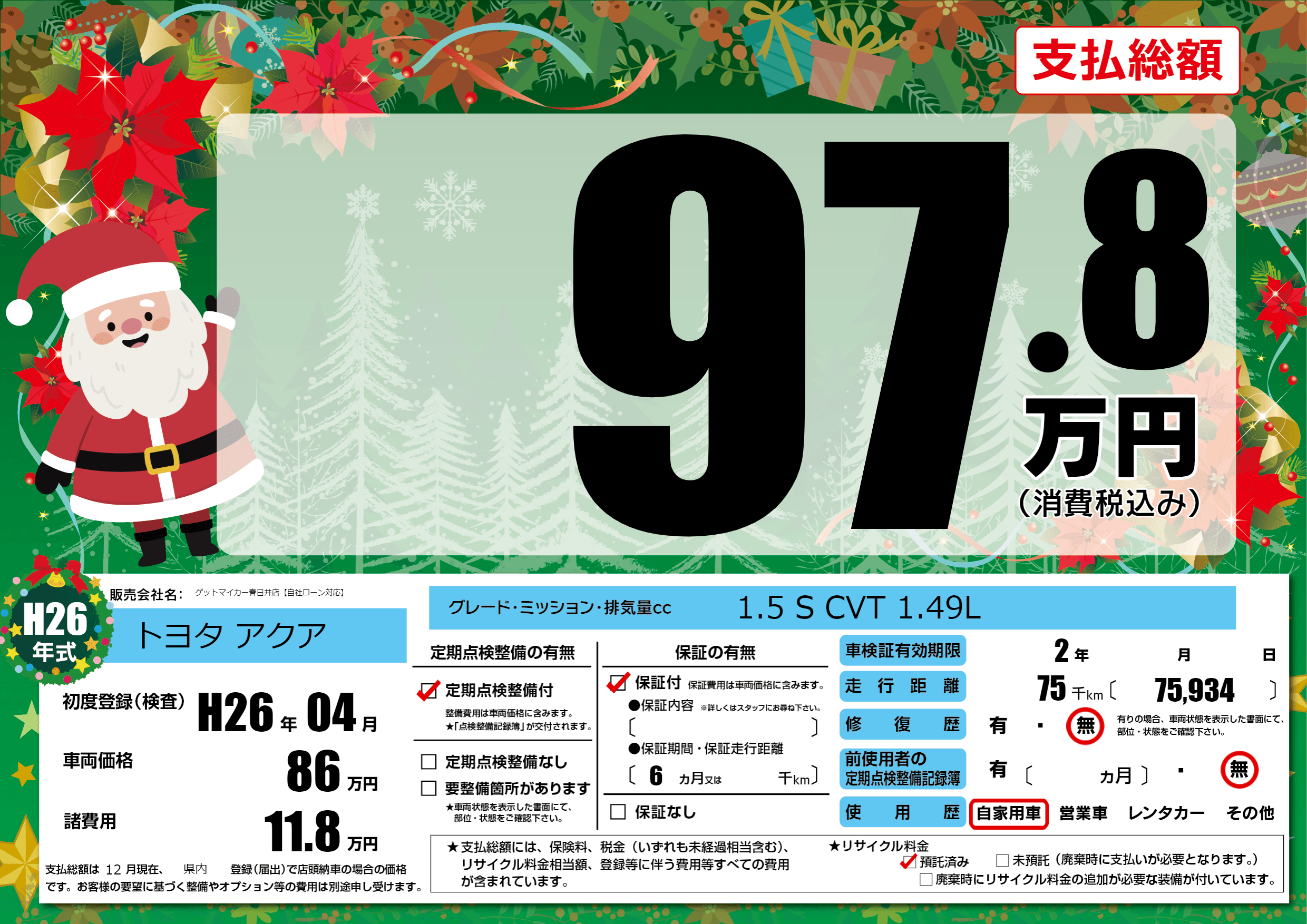 | 車名 | トヨタ アクア | グレード ミッション 排気量 |