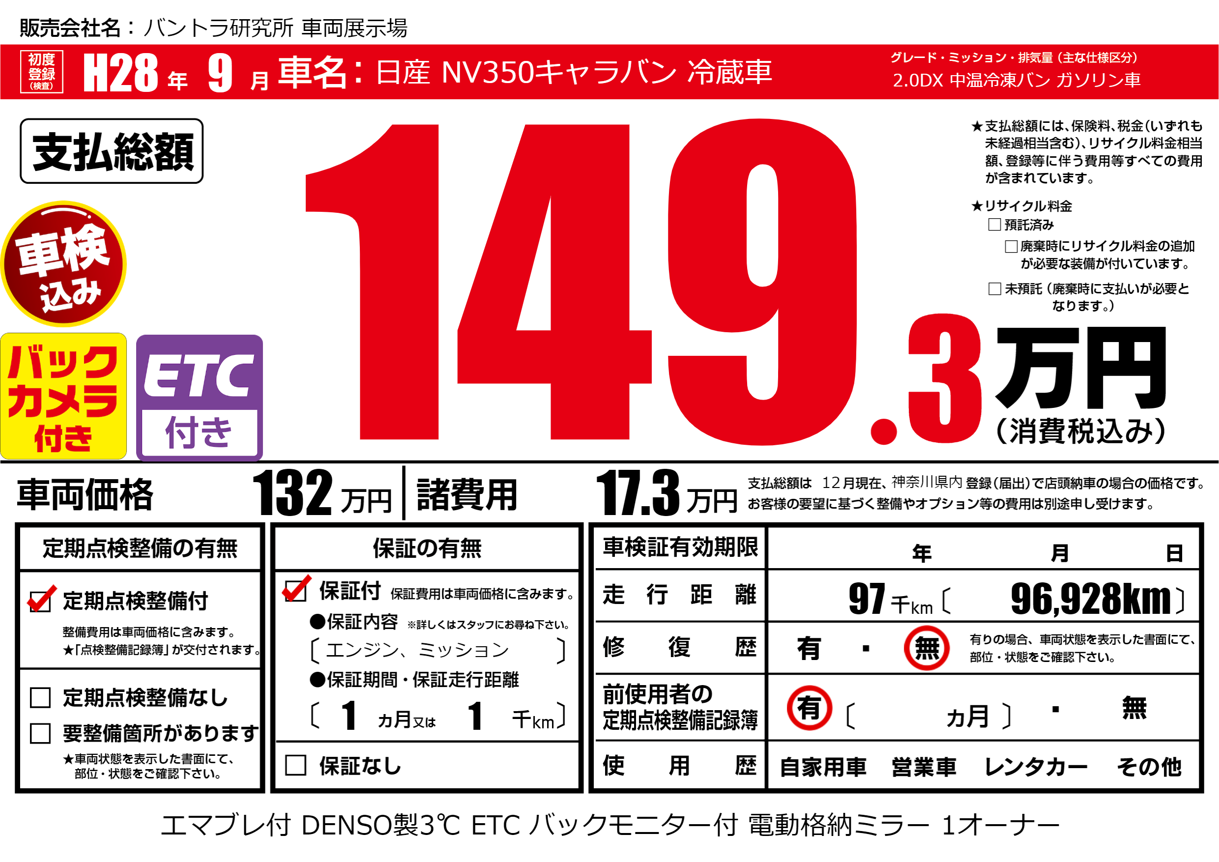 | 車名 | 日産 NV350キャラバン 冷蔵車 | グレード ミッション 排気量 |