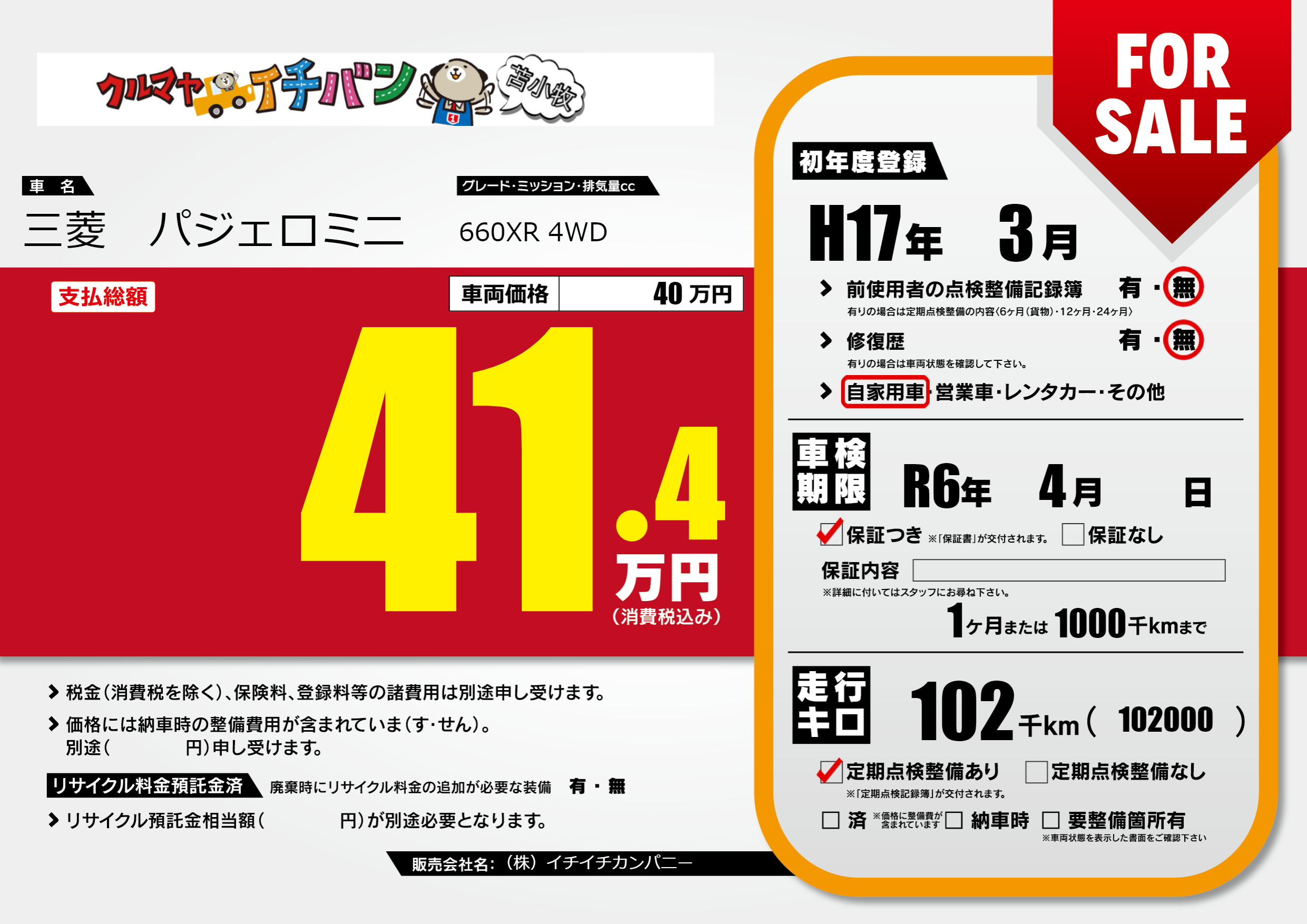 なし | 車検制限 | R6年4月---月 |