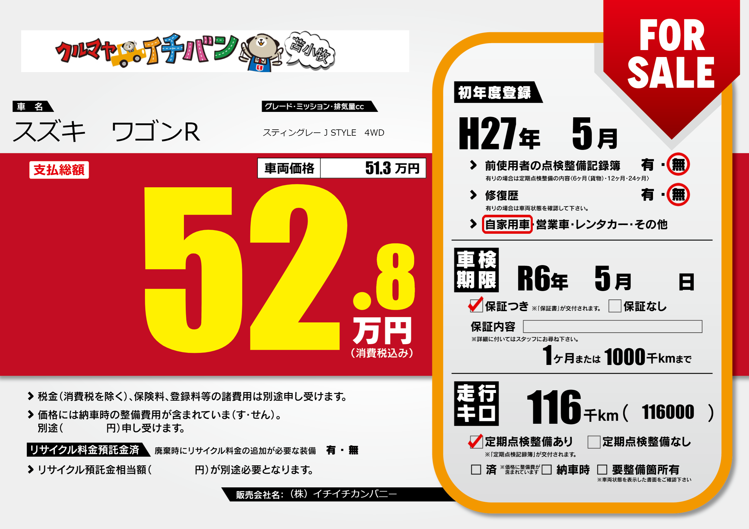 | 走行キロ | 11.6万km | 初年度登録 | H27年5月 |