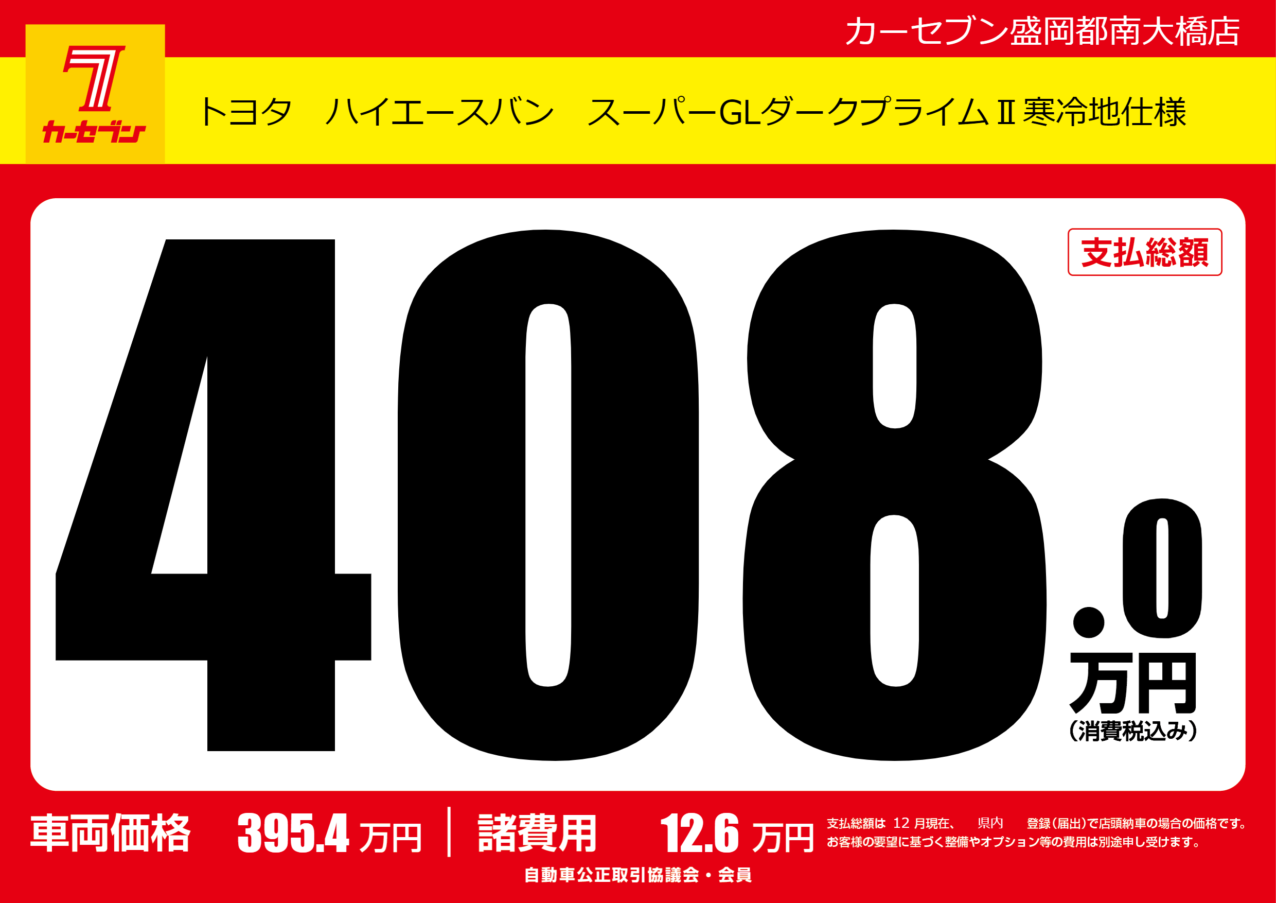 | 車名 | トヨタ ハイエースバン スーパーGLダークプライムⅡ寒冷地仕様 | グレード ミッション 排気量 |