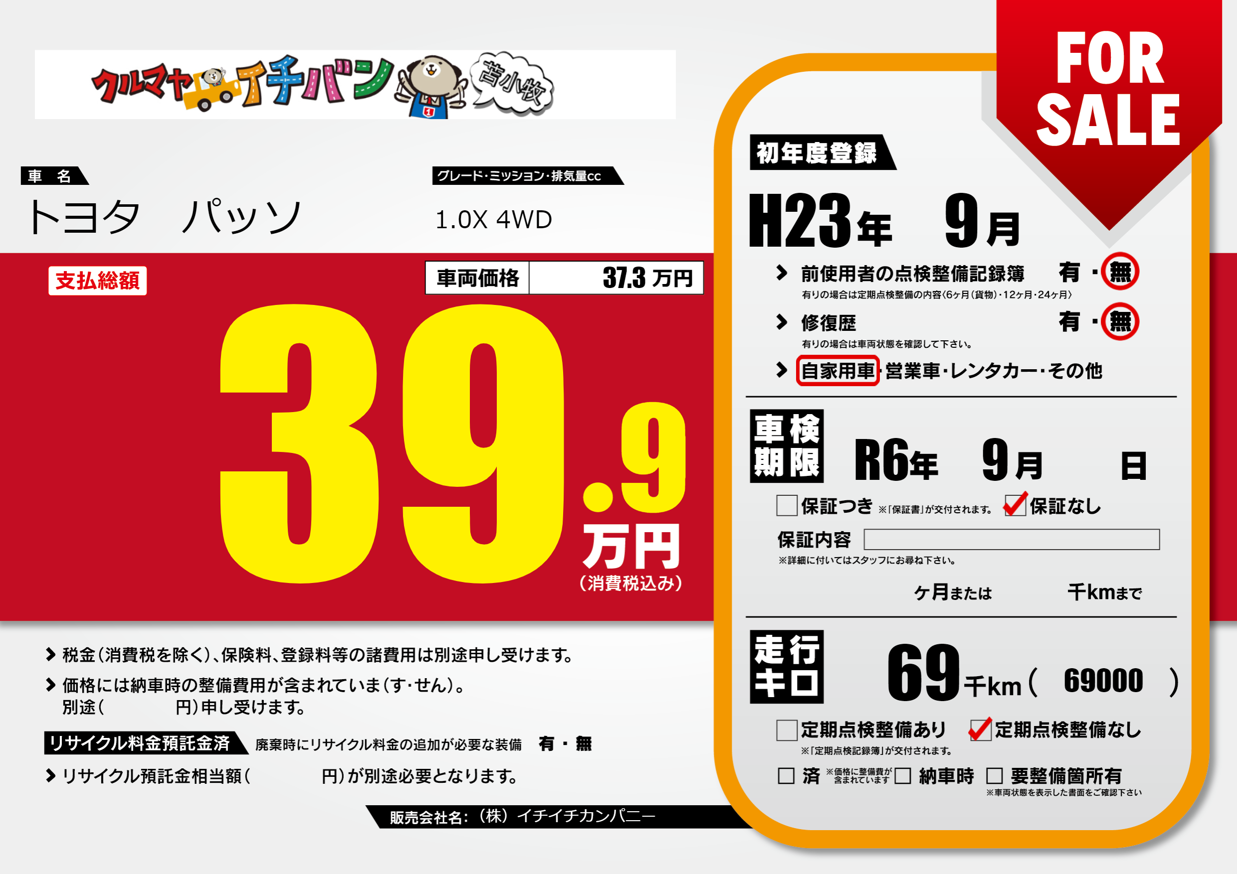| 車名 | トヨタ パッソ | グレード ミッション 排気量 |