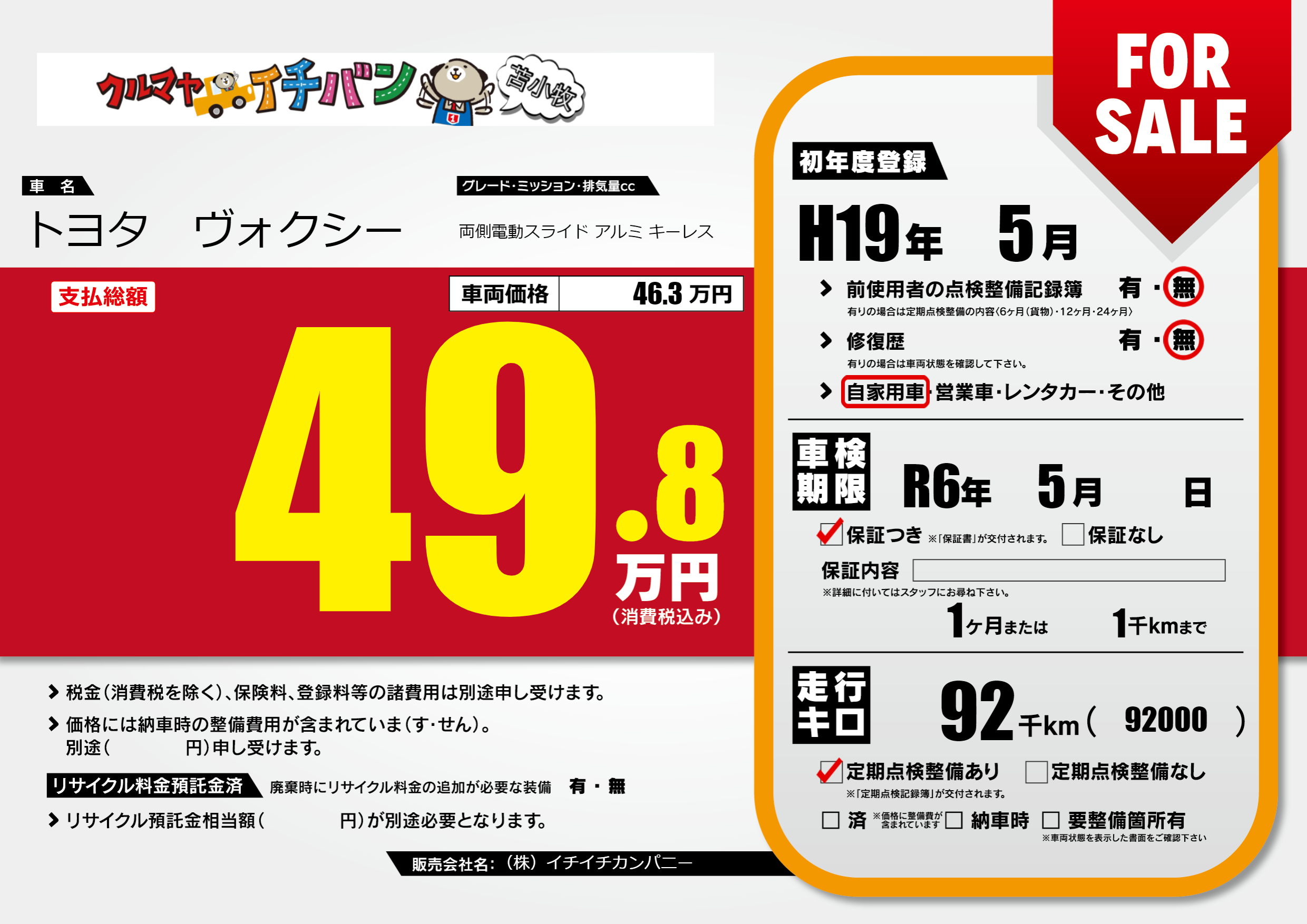| 走行キロ | 9.2万km | 初年度登録 | H19年5月 |