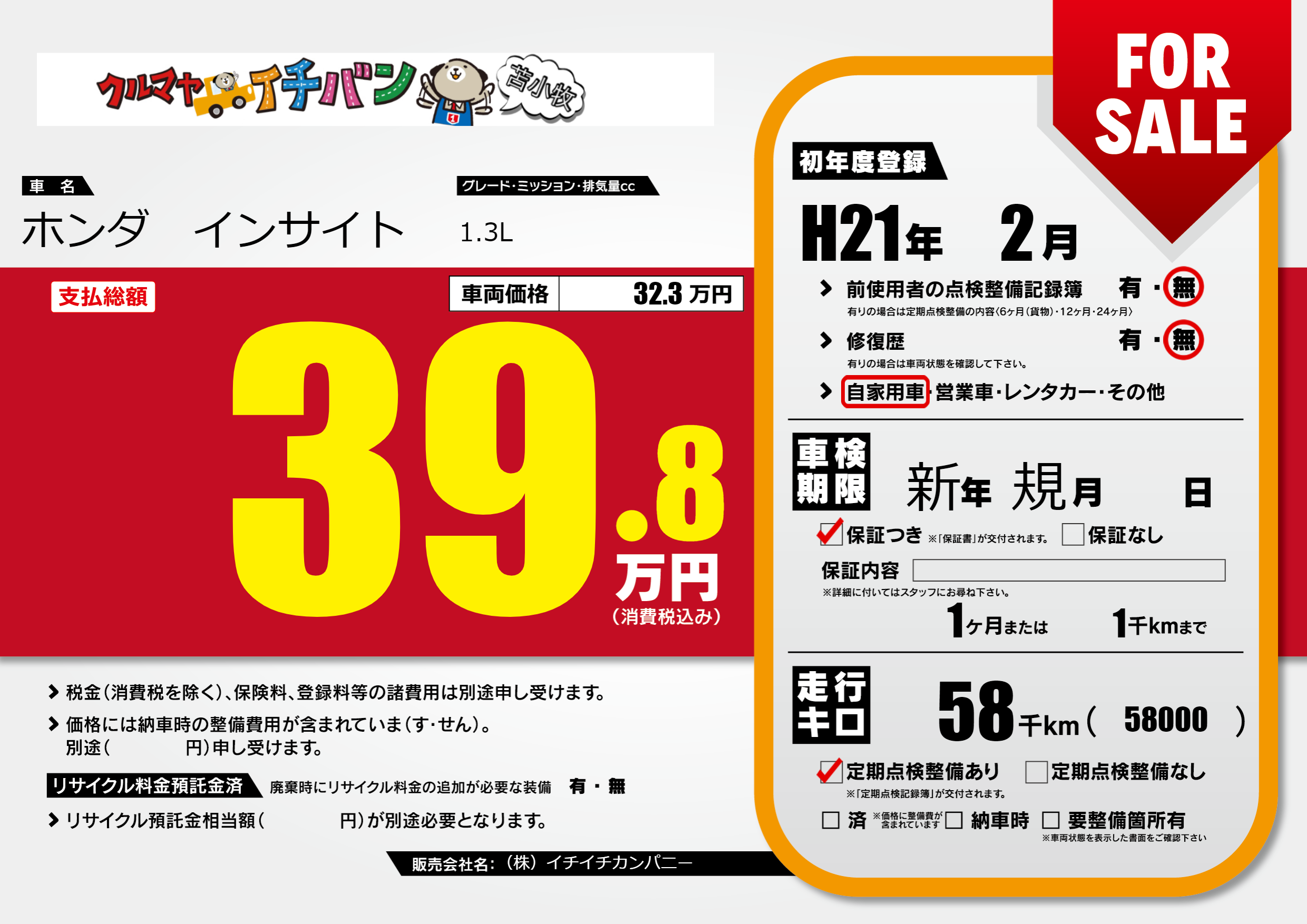 | 走行キロ | 5.8万km | 初年度登録 | H21年2月 |