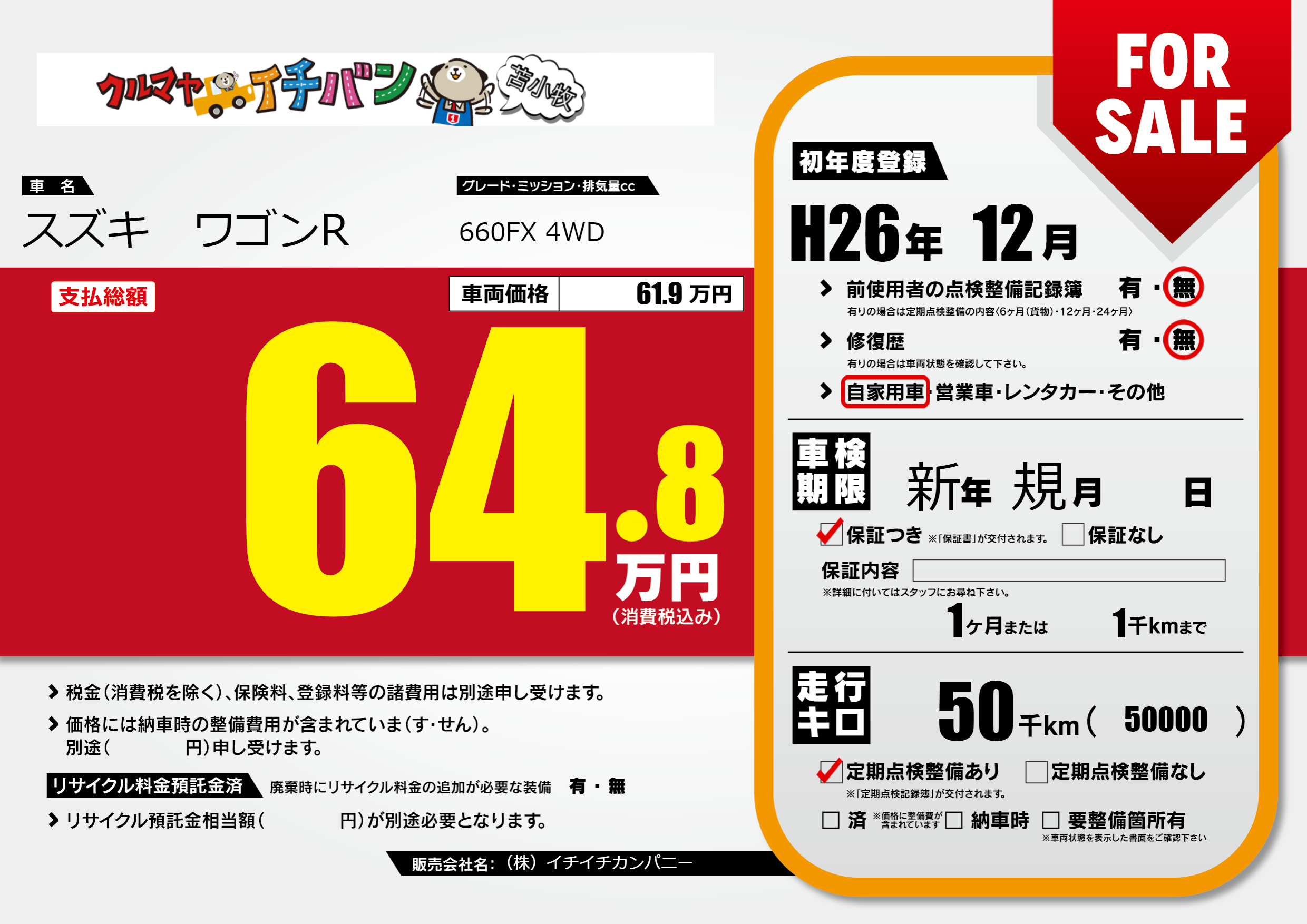 | 走行キロ | 5万km | 初年度登録 | H26年12月 |