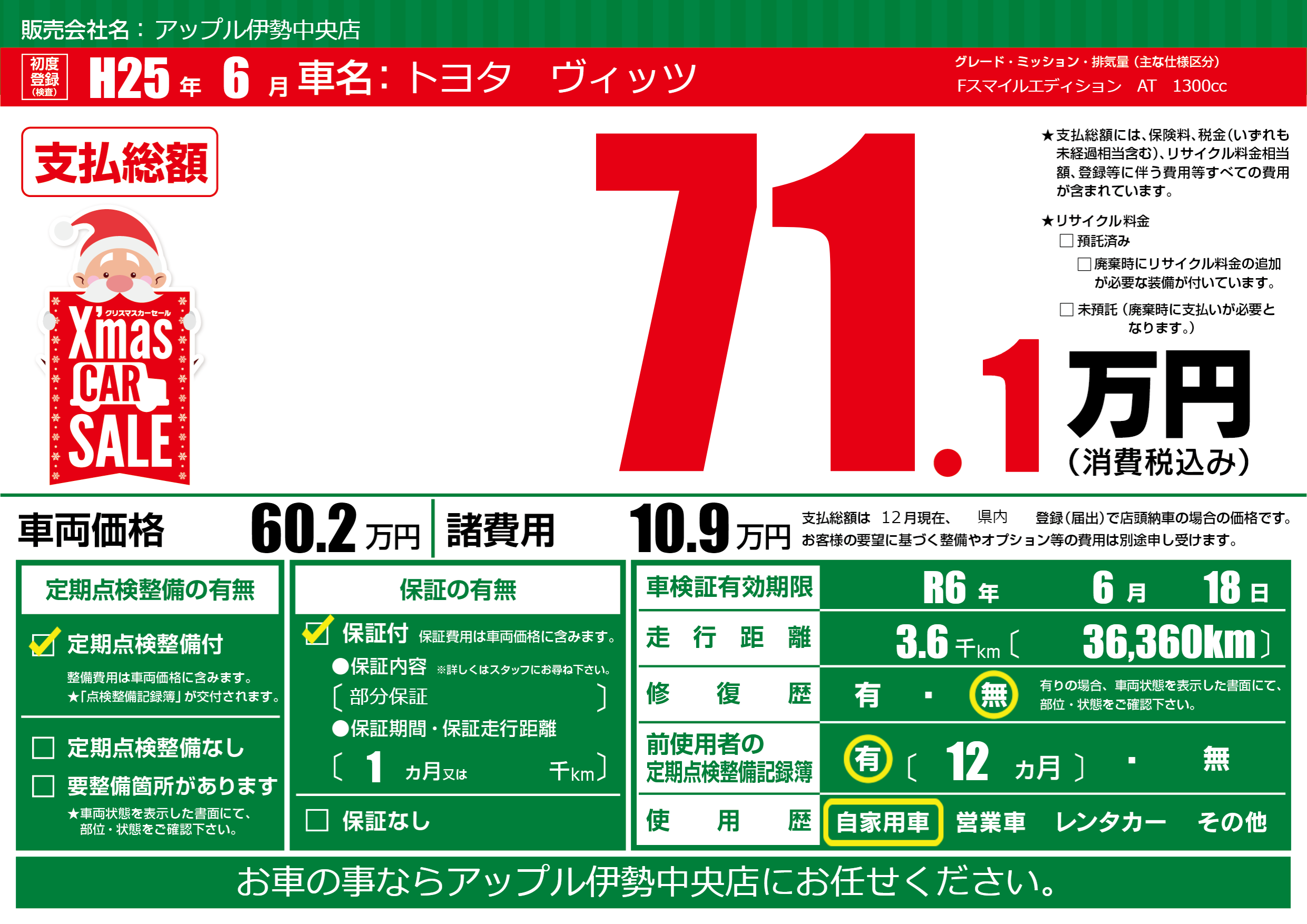 | 走行キロ | 0.3万km | 初年度登録 | H25年6月 |