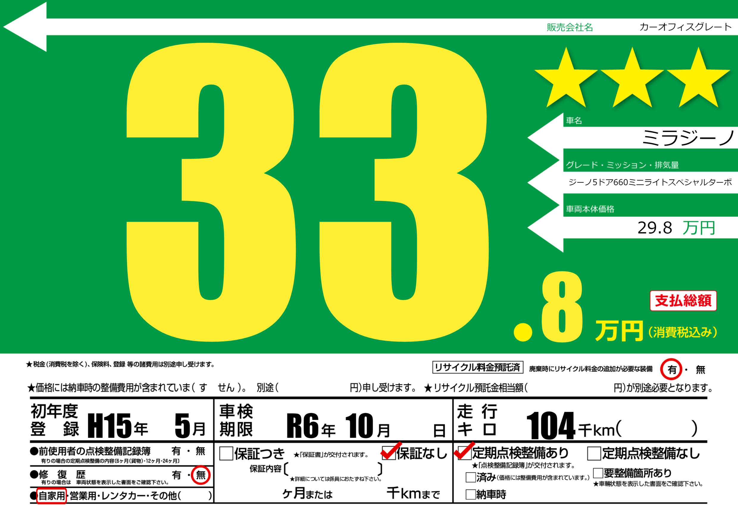 | 車名 | ミラジーノ | グレード ミッション 排気量 |