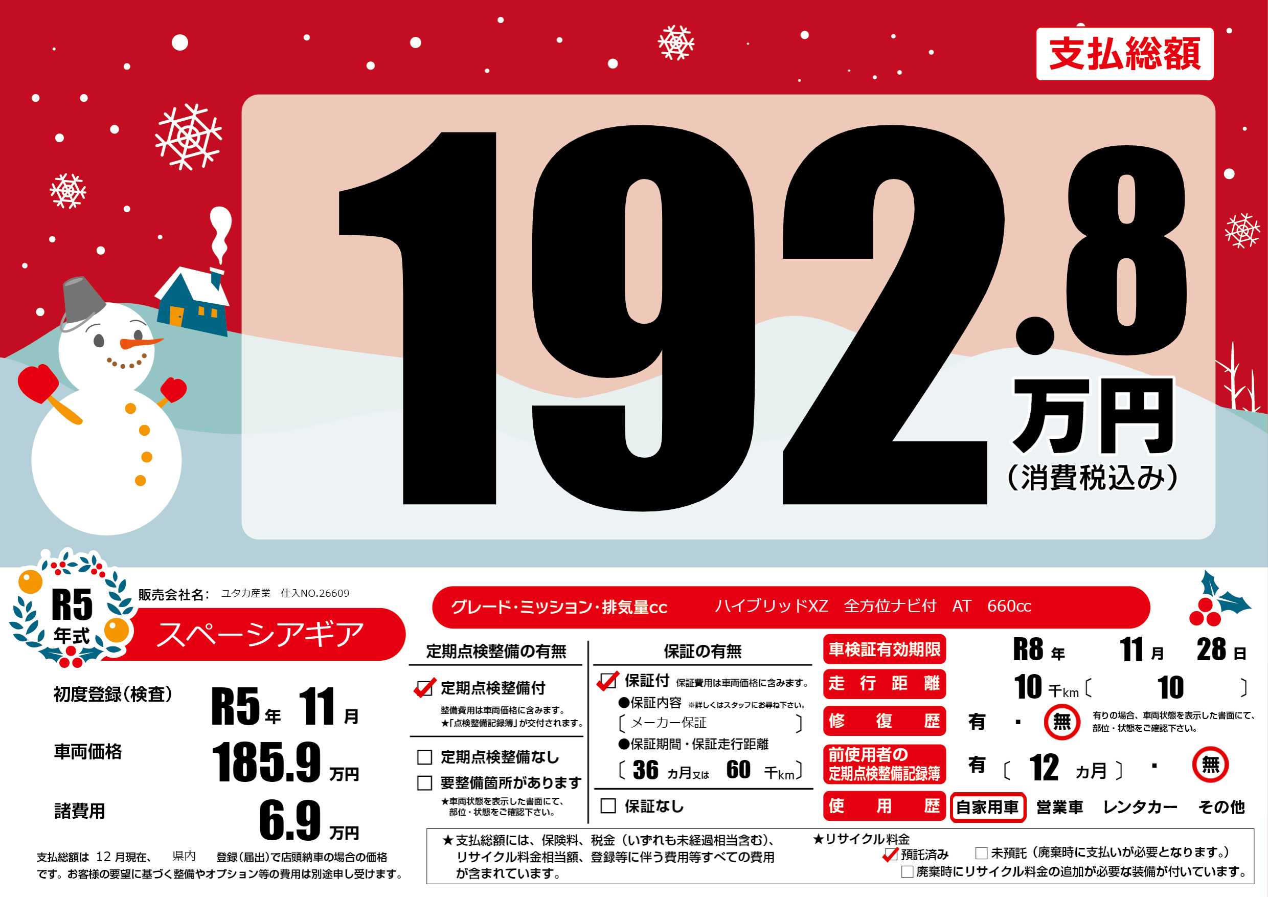 | 走行キロ | 1万km | 初年度登録 | R5年11月 |
