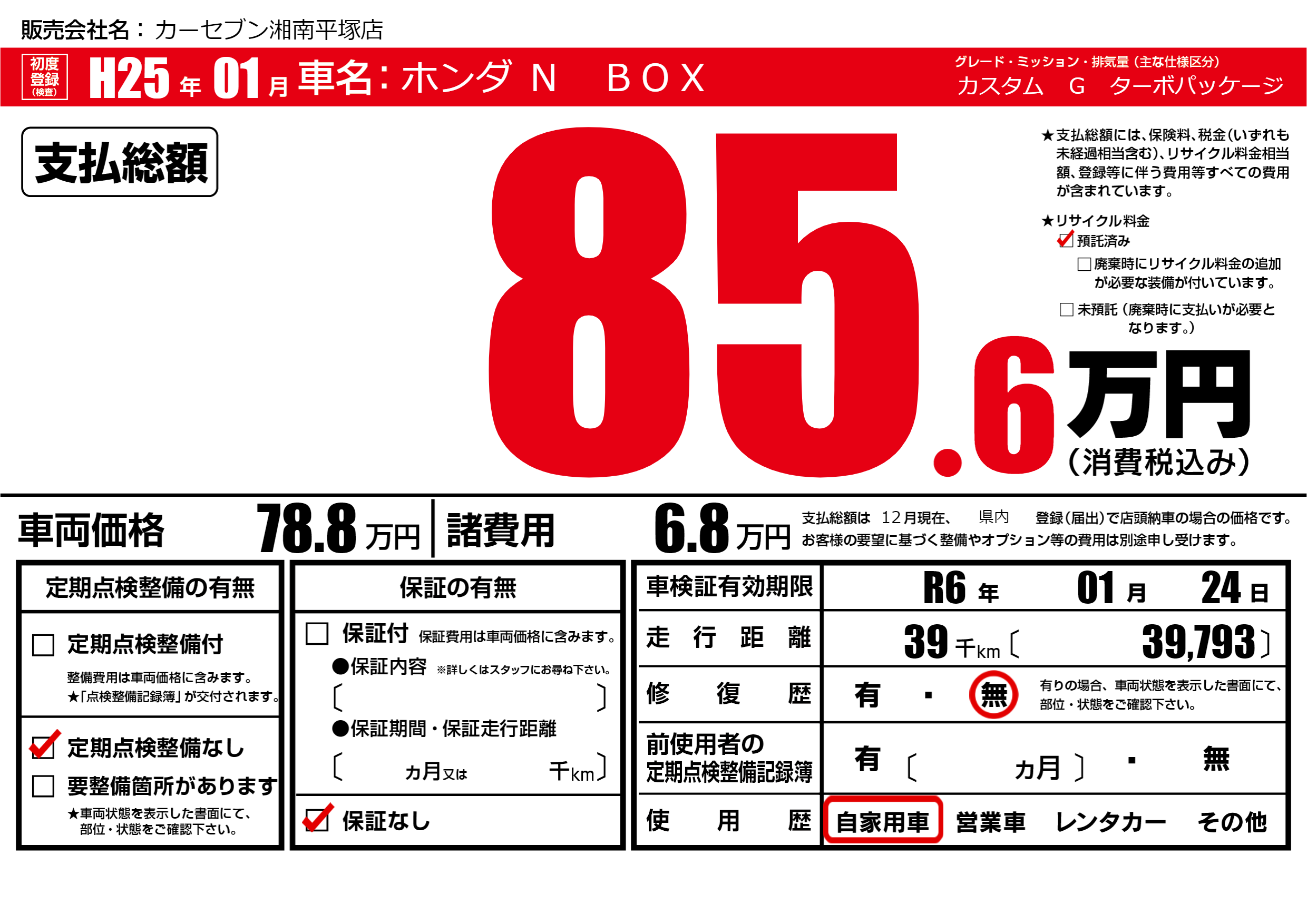 なし | 車検制限 | R6年01月24月 |