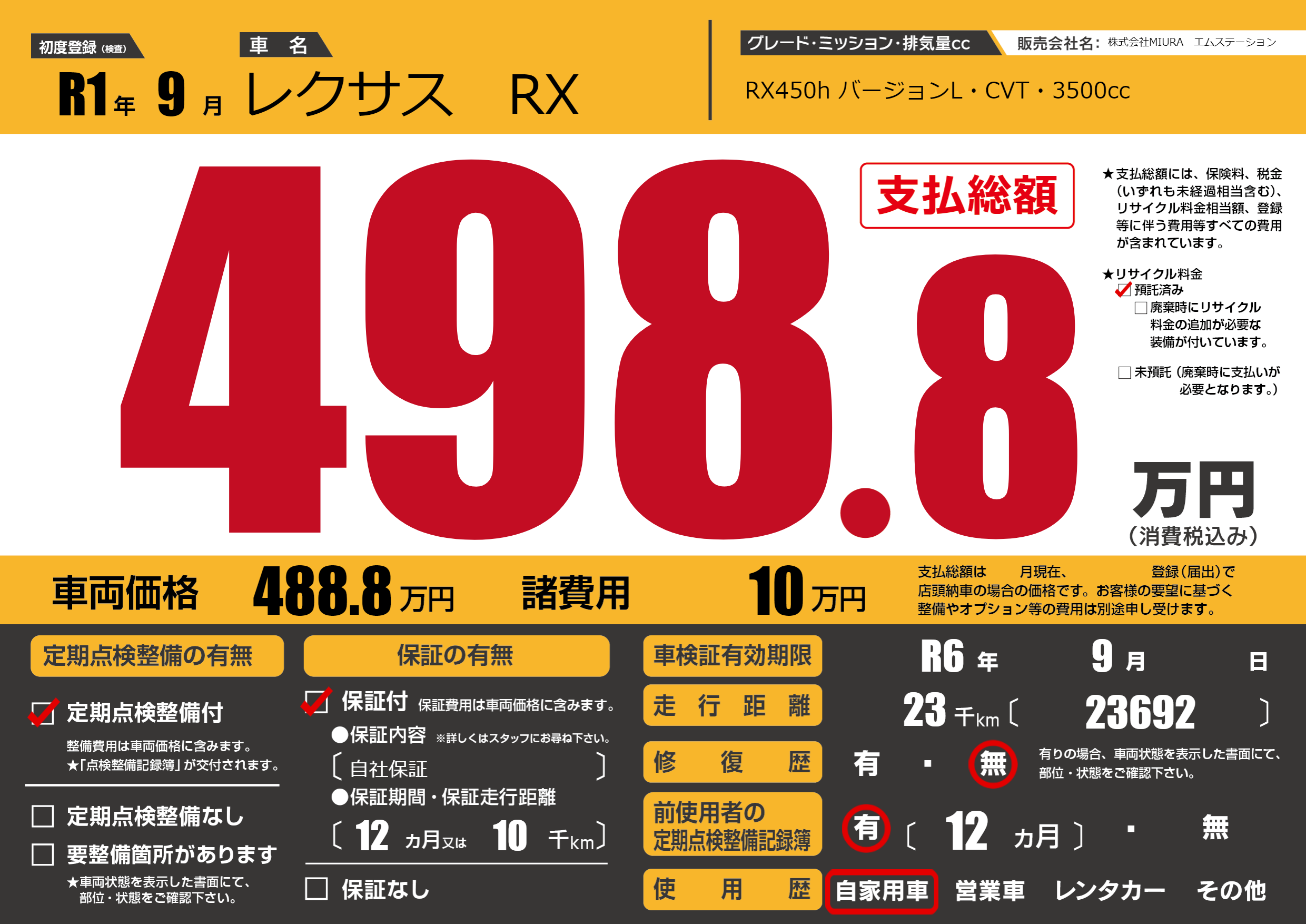 | 車名 | レクサス RX | グレード ミッション 排気量 |