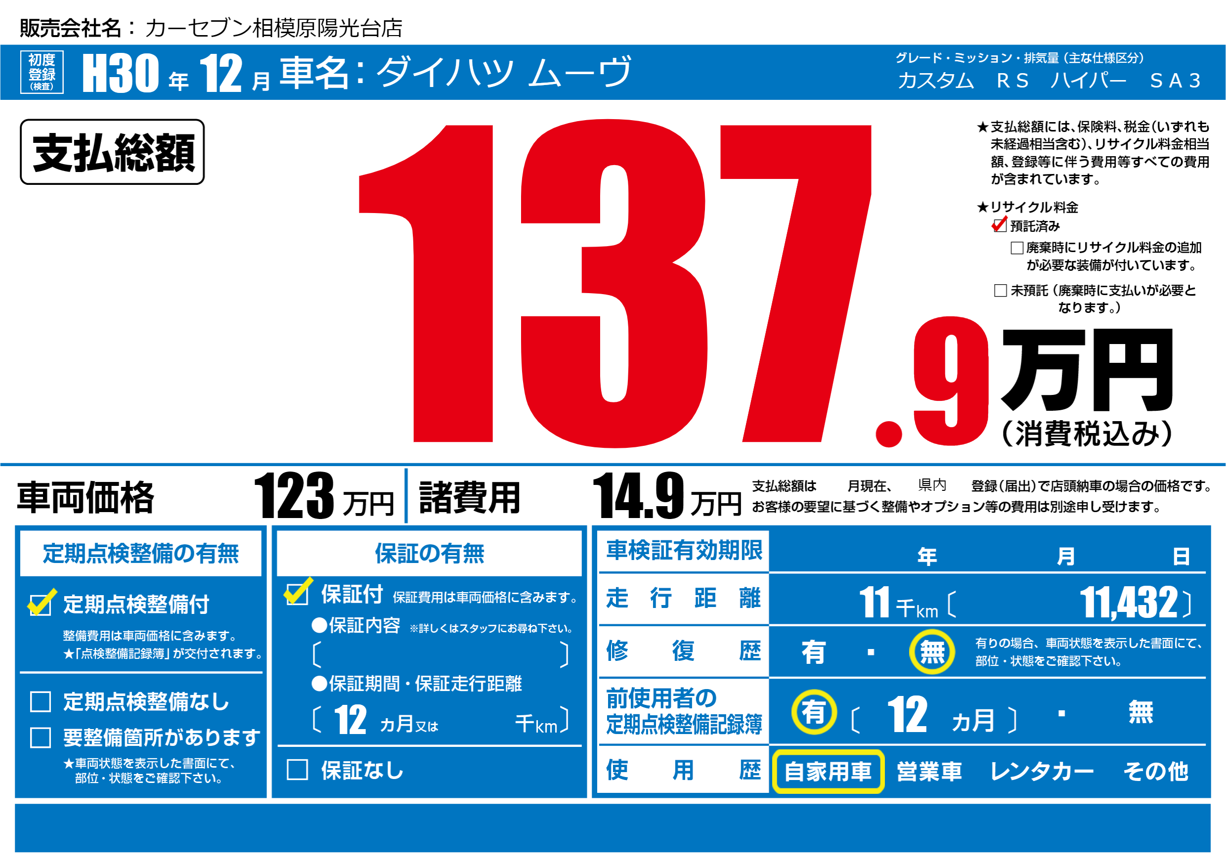 | 走行キロ | 1.1万km | 初年度登録 | H30年12月 |