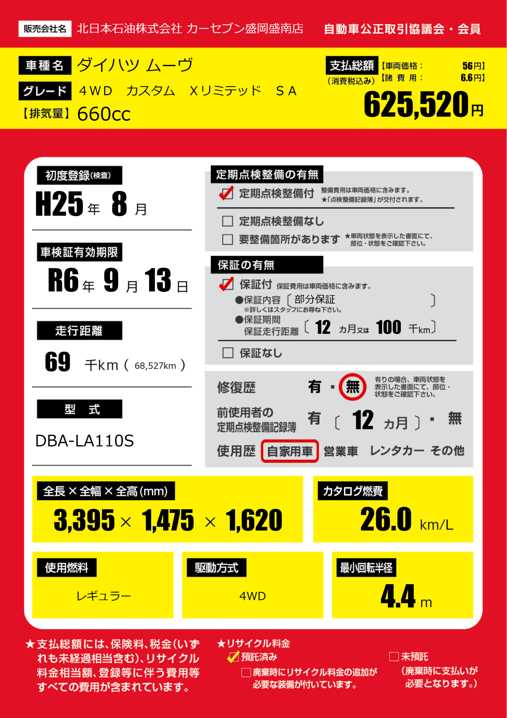 | 車名 | ダイハツ ムーヴ | グレード ミッション 排気量 |