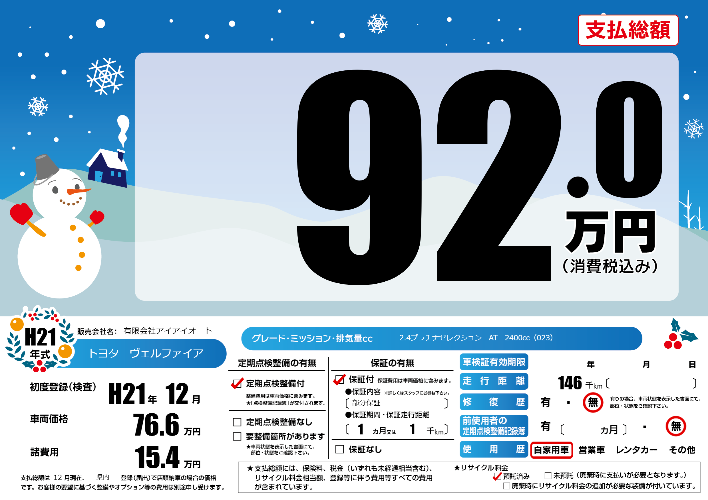 | 走行キロ | 14.6万km | 初年度登録 | H21年12月 |