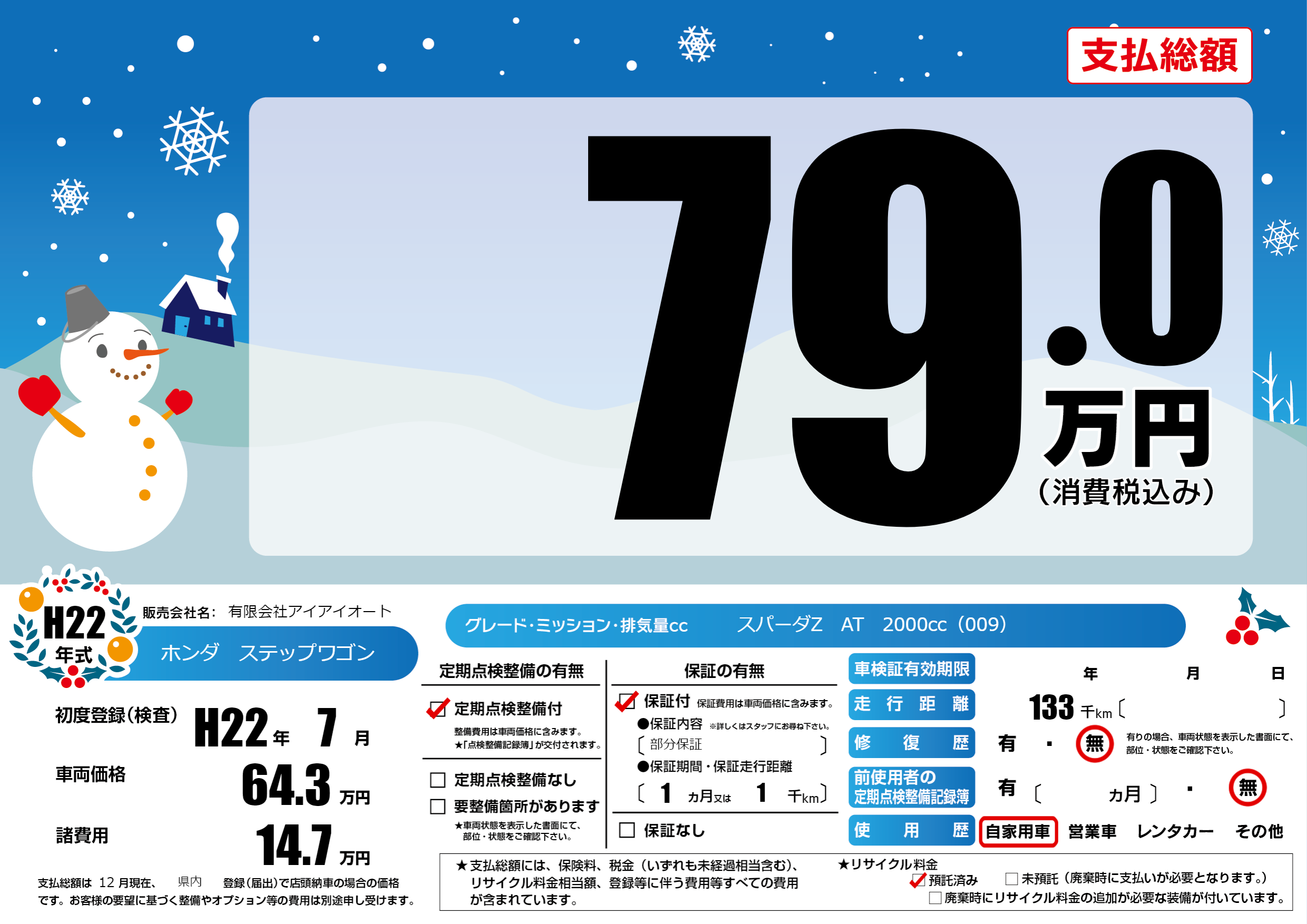 | 走行キロ | 13.3万km | 初年度登録 | H22年7月 |