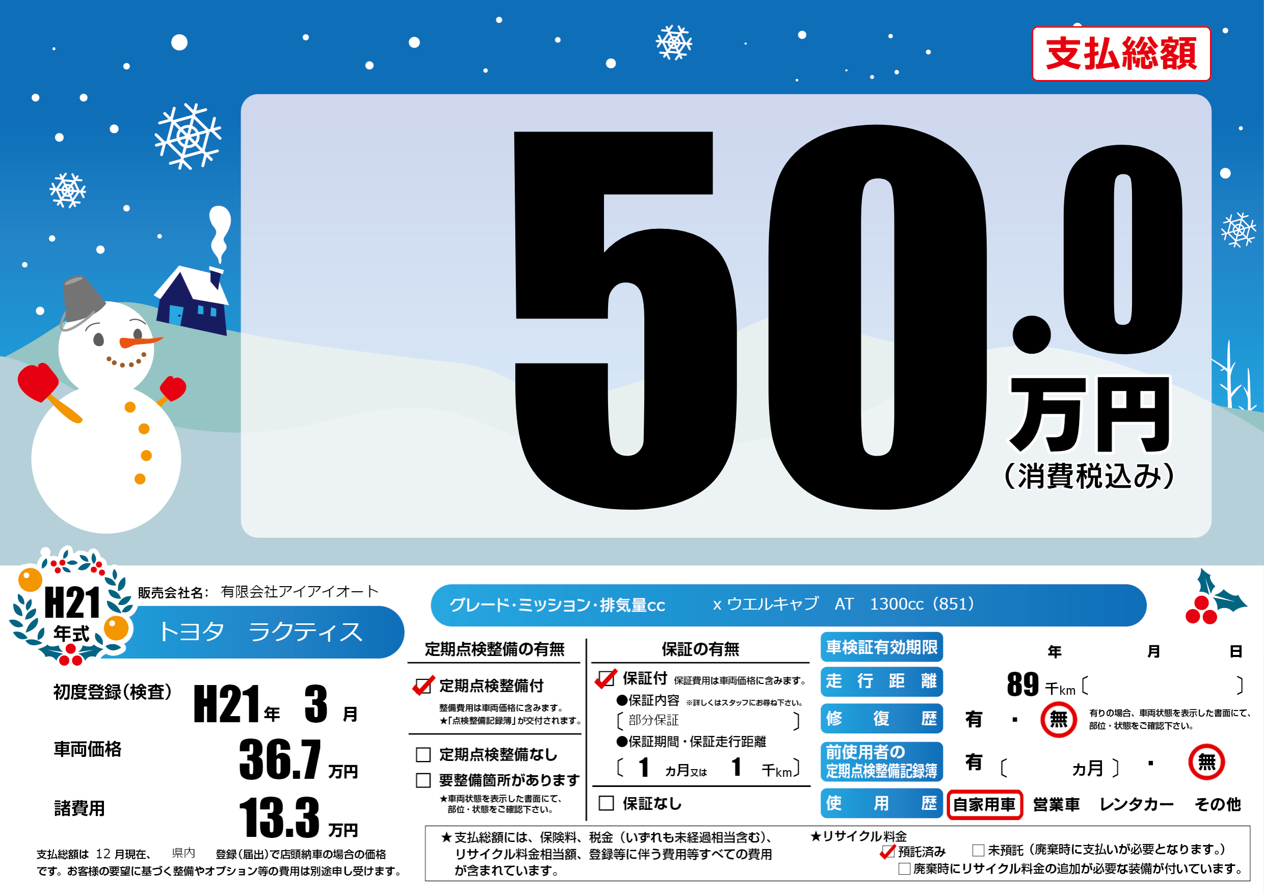 | 車名 | トヨタ ラクティス | グレード ミッション 排気量 |