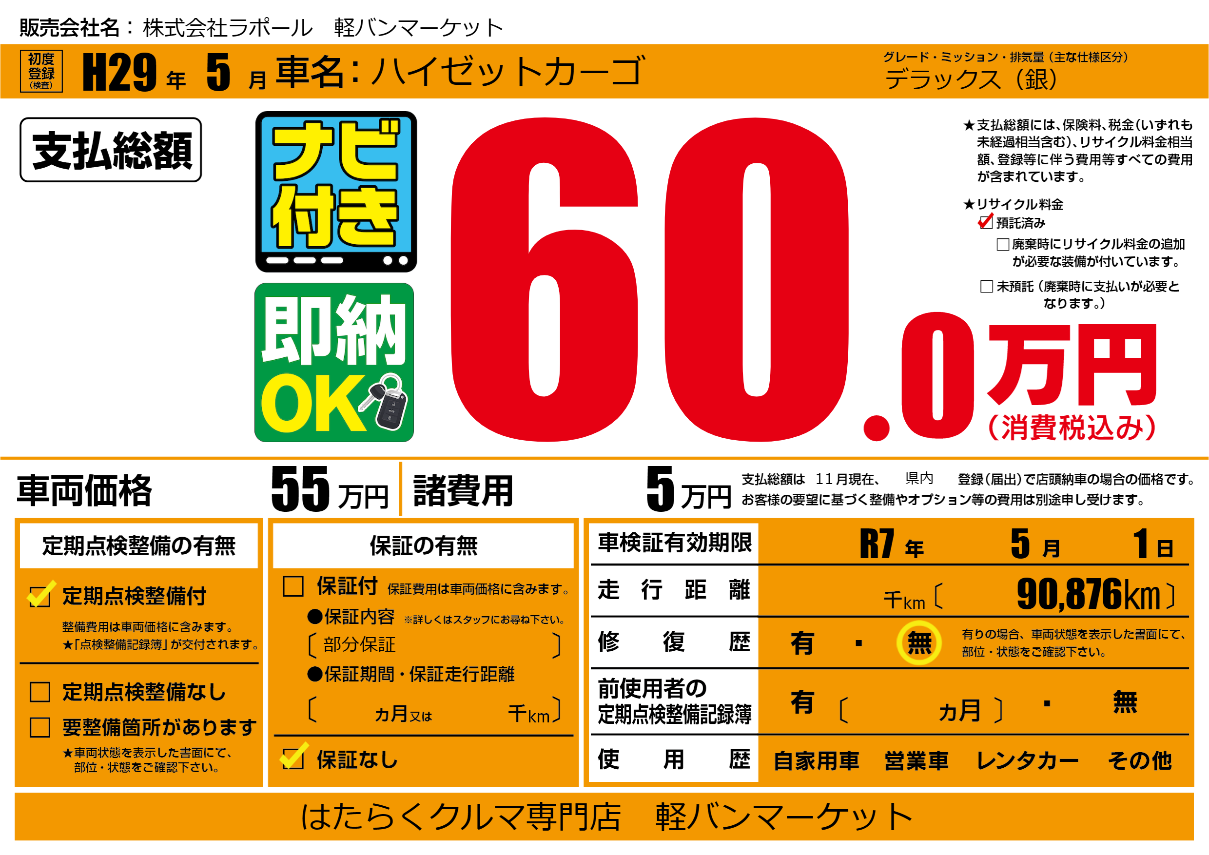 | 車名 | ハイゼットカーゴ | グレード ミッション 排気量 |