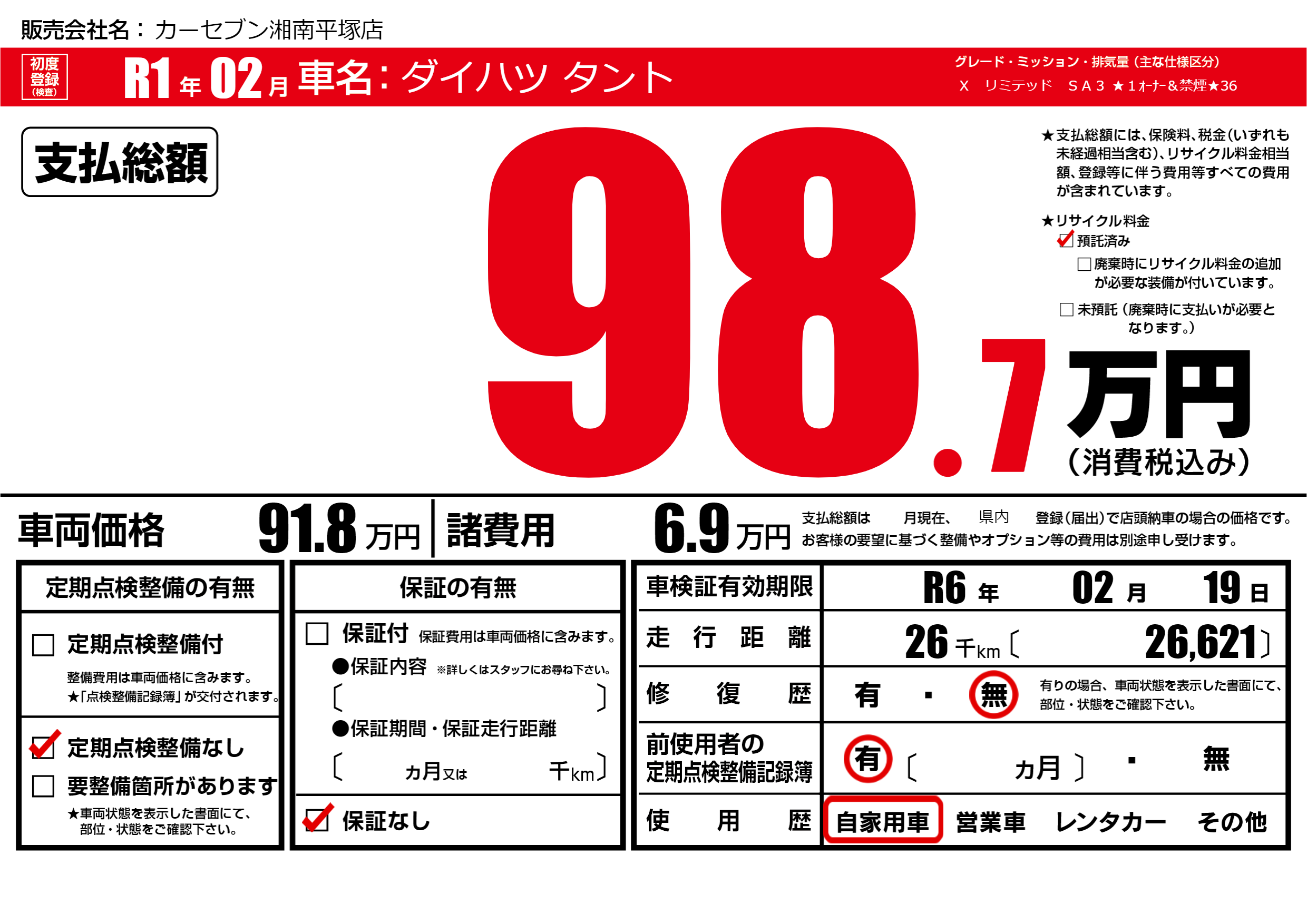 | 車名 | ダイハツ タント | グレード ミッション 排気量 |