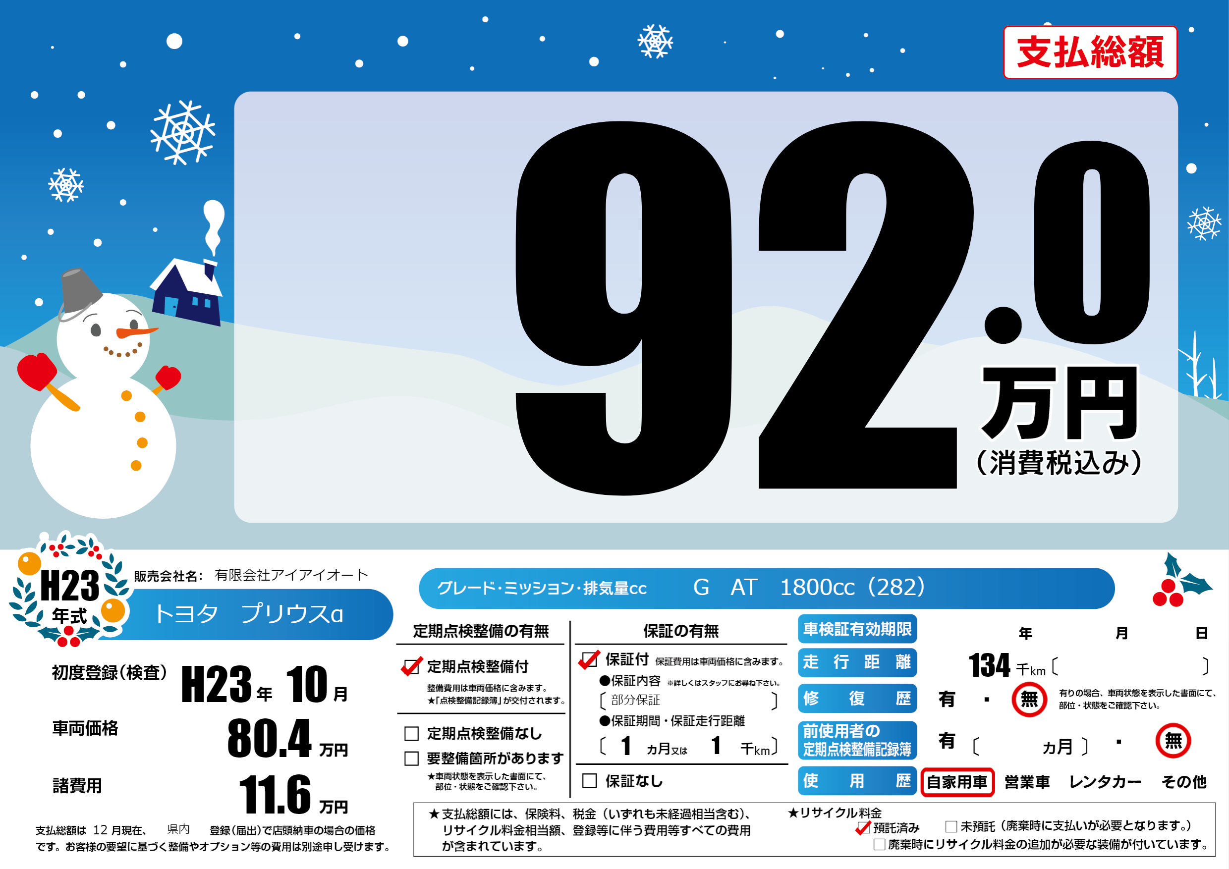 | 車名 | トヨタ プリウスα | グレード ミッション 排気量 |