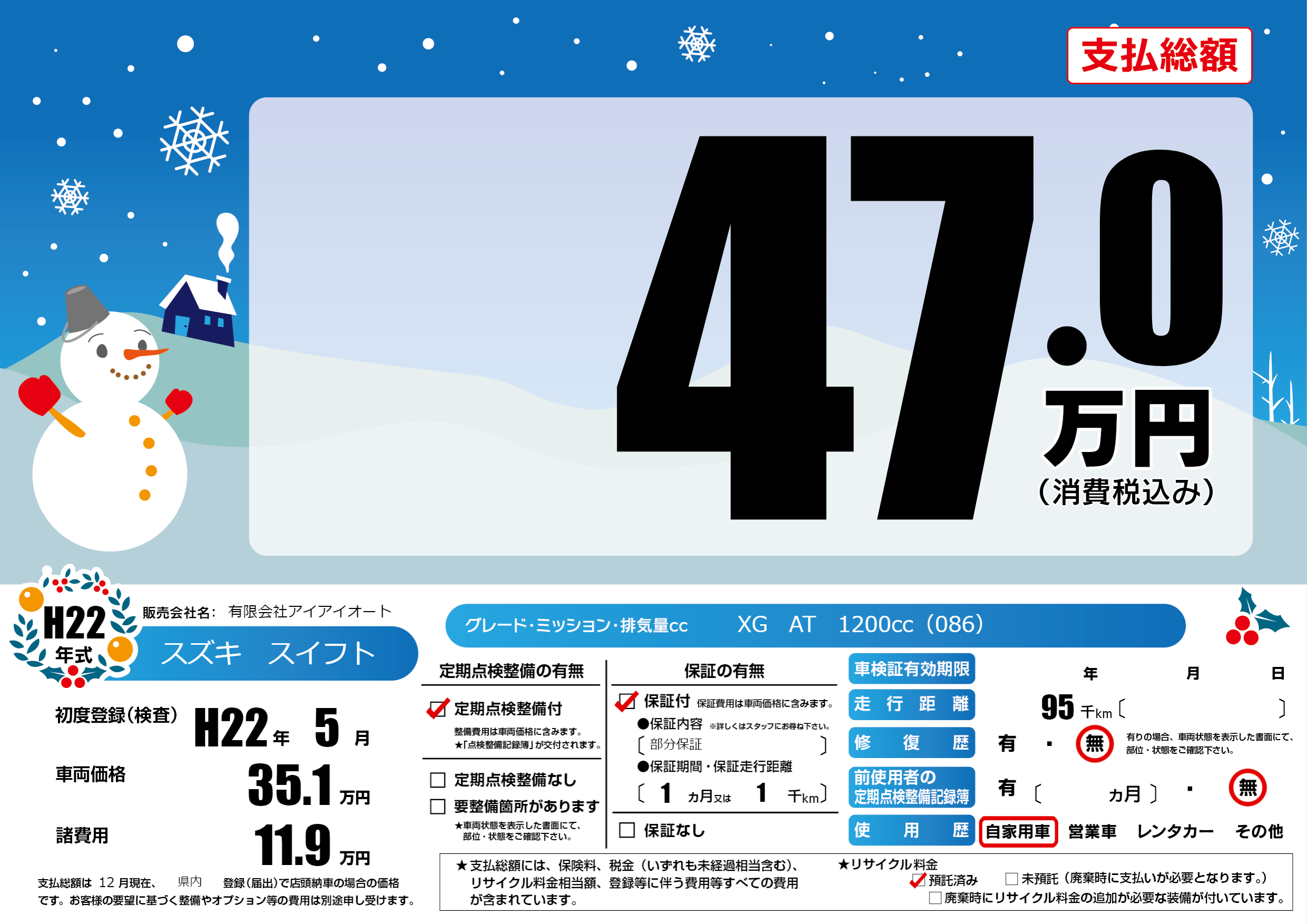 | 走行キロ | 9.5万km | 初年度登録 | H22年5月 |