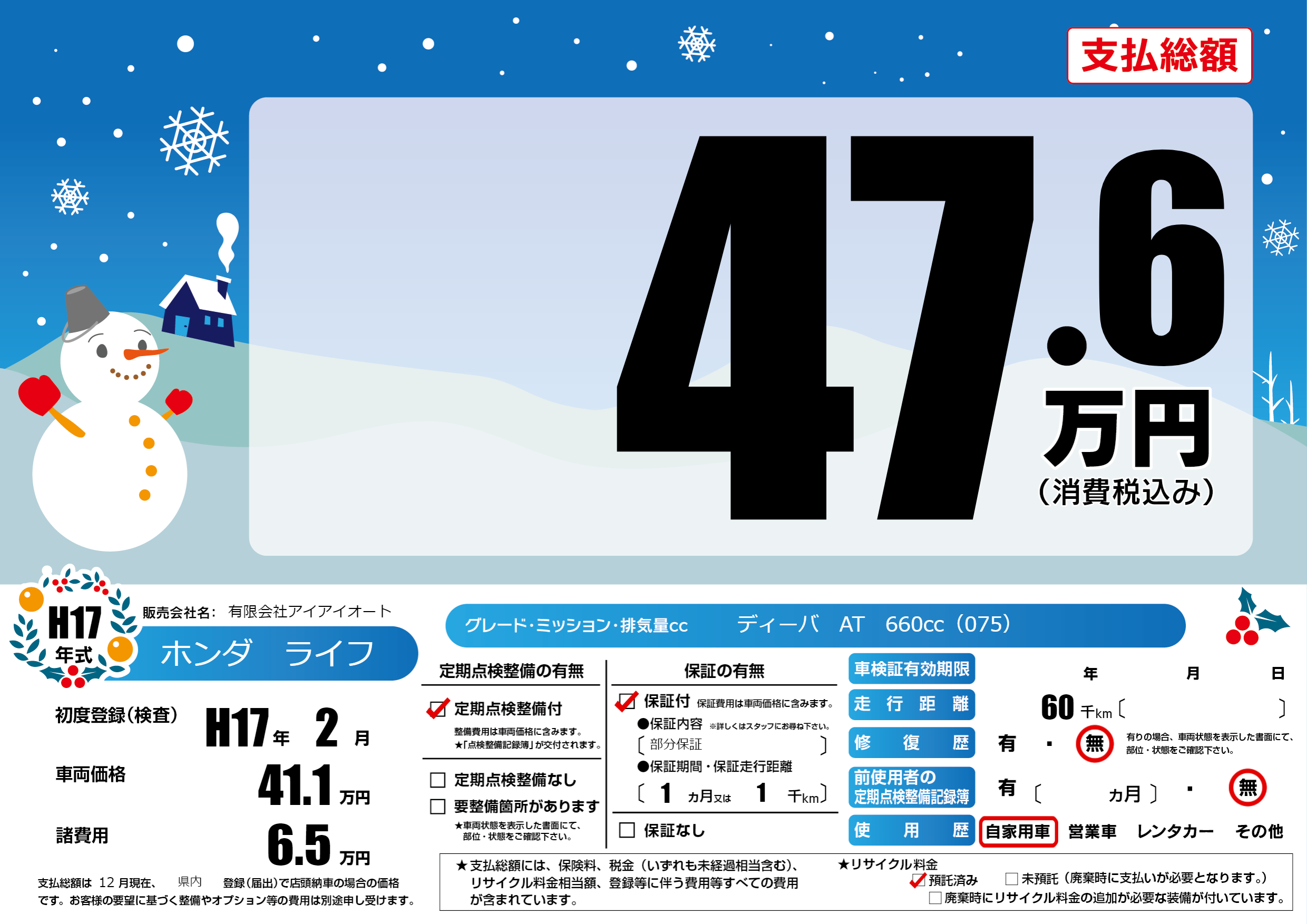 | 走行キロ | 6万km | 初年度登録 | H17年2月 |