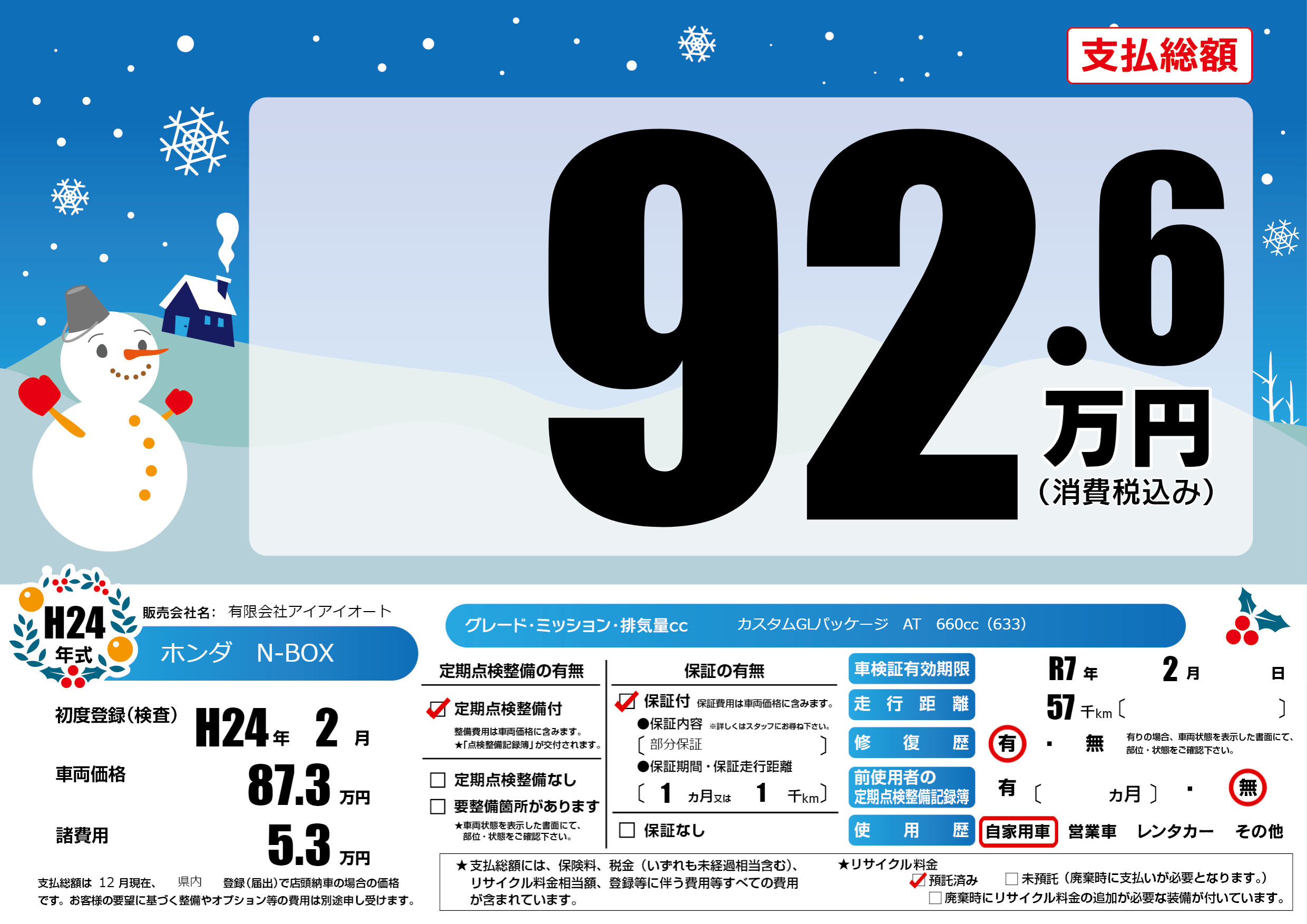 | 車名 | ホンダ N-BOX | グレード ミッション 排気量 |