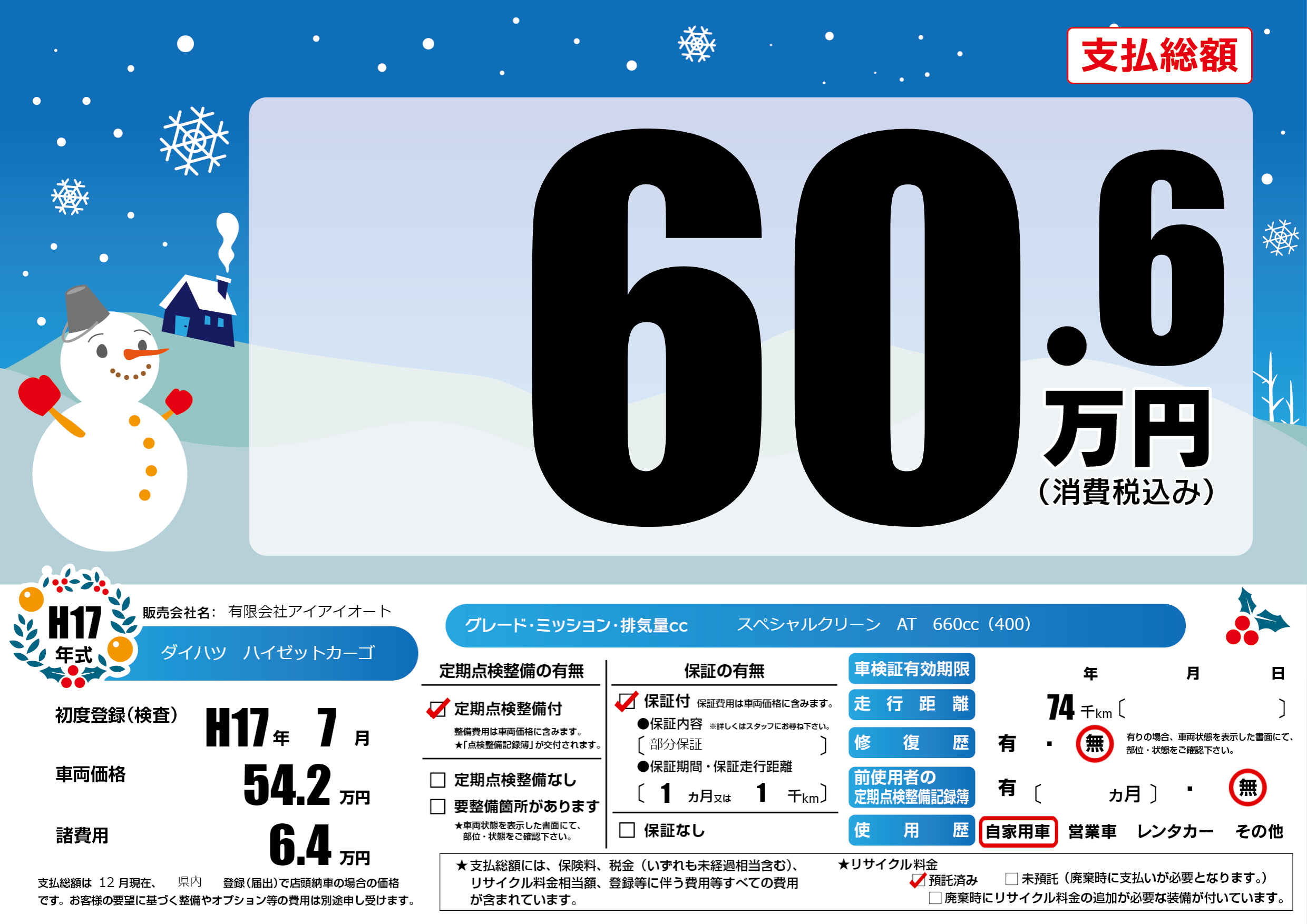 | 車名 | ダイハツ ハイゼットカーゴ | グレード ミッション 排気量 |
