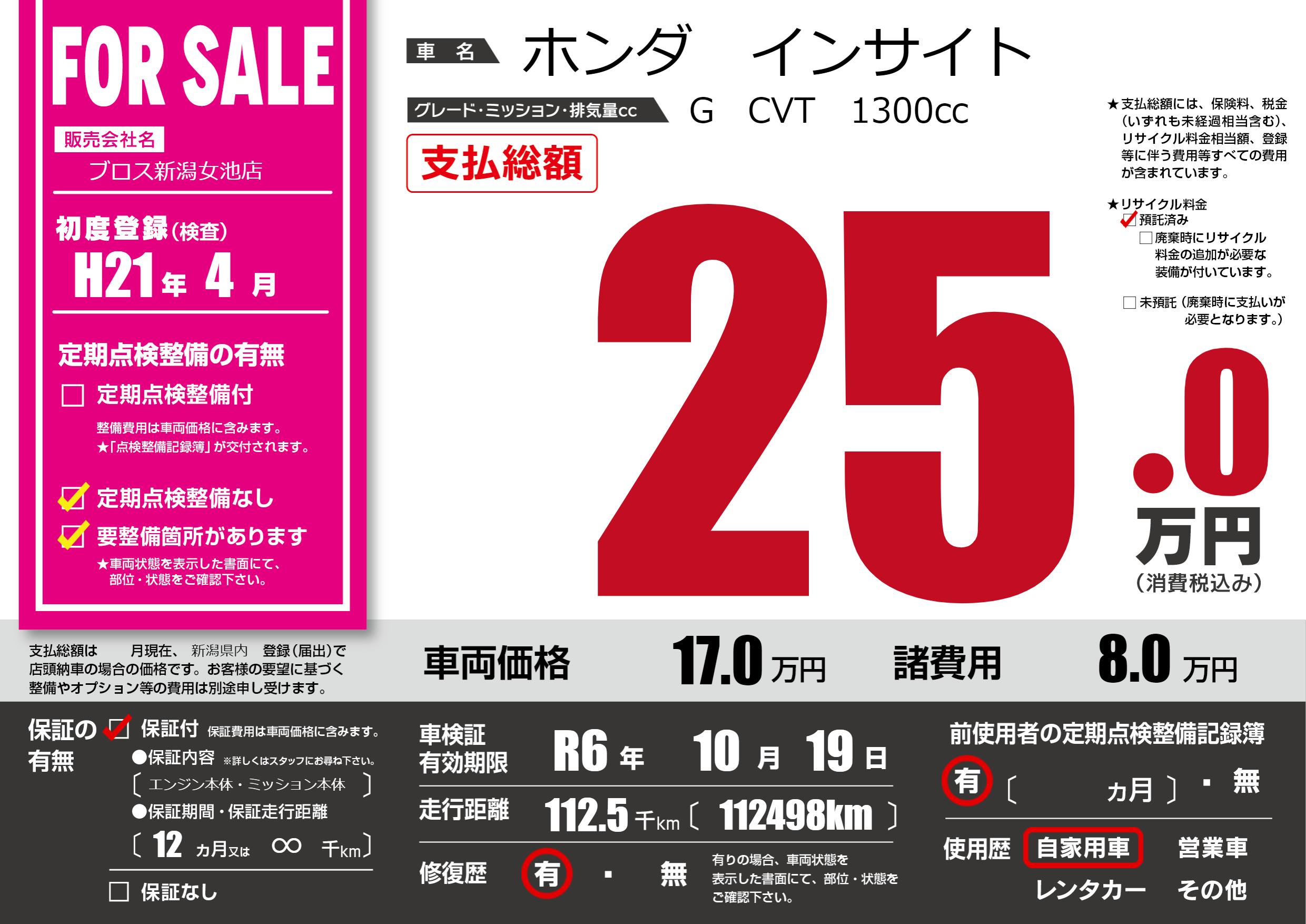 | 車名 | ホンダ インサイト | グレード ミッション 排気量 |