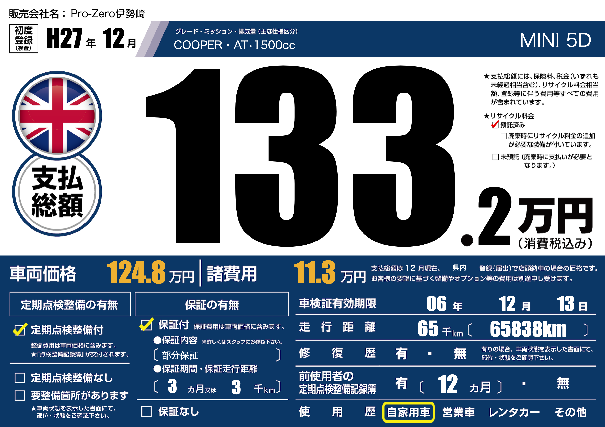 | 車名 | MINI 5D | グレード ミッション 排気量 |