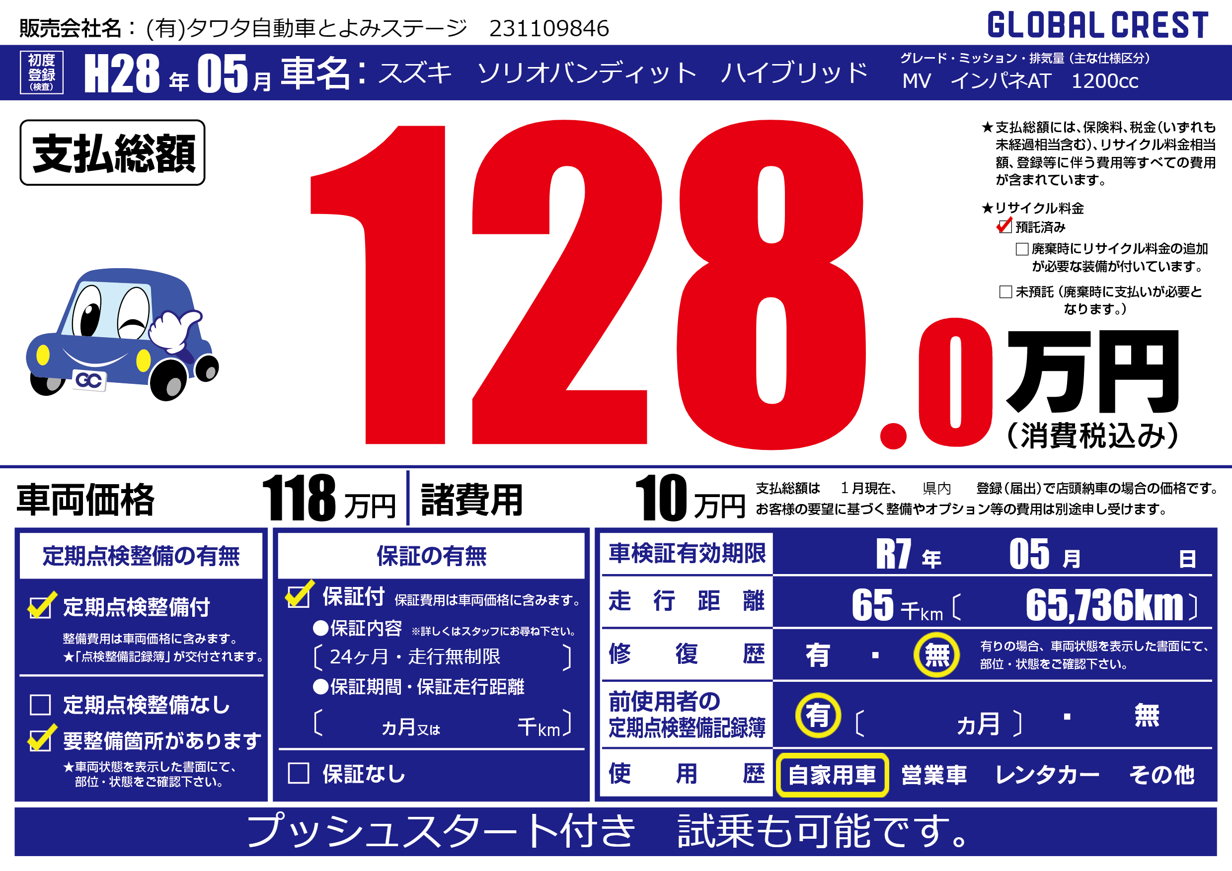 | 車名 | スズキ ソリオバンディット ハイブリッド | グレード ミッション 排気量 |