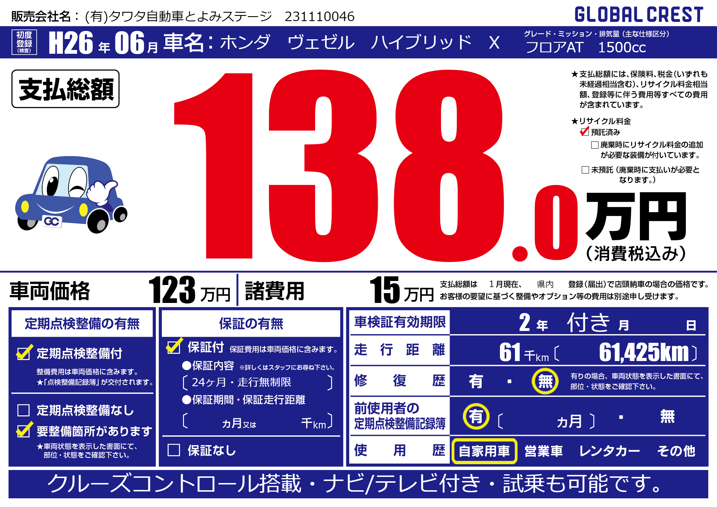 | 走行キロ | 6.1万km | 初年度登録 | H26年06月 |