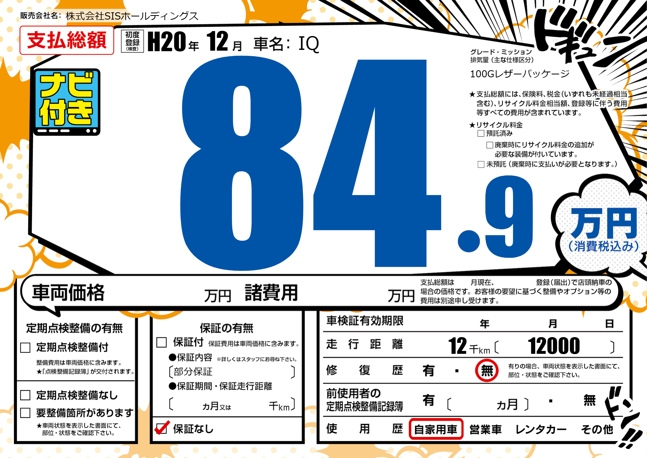 | 走行キロ | 1.2万km | 初年度登録 | H20年12月 |