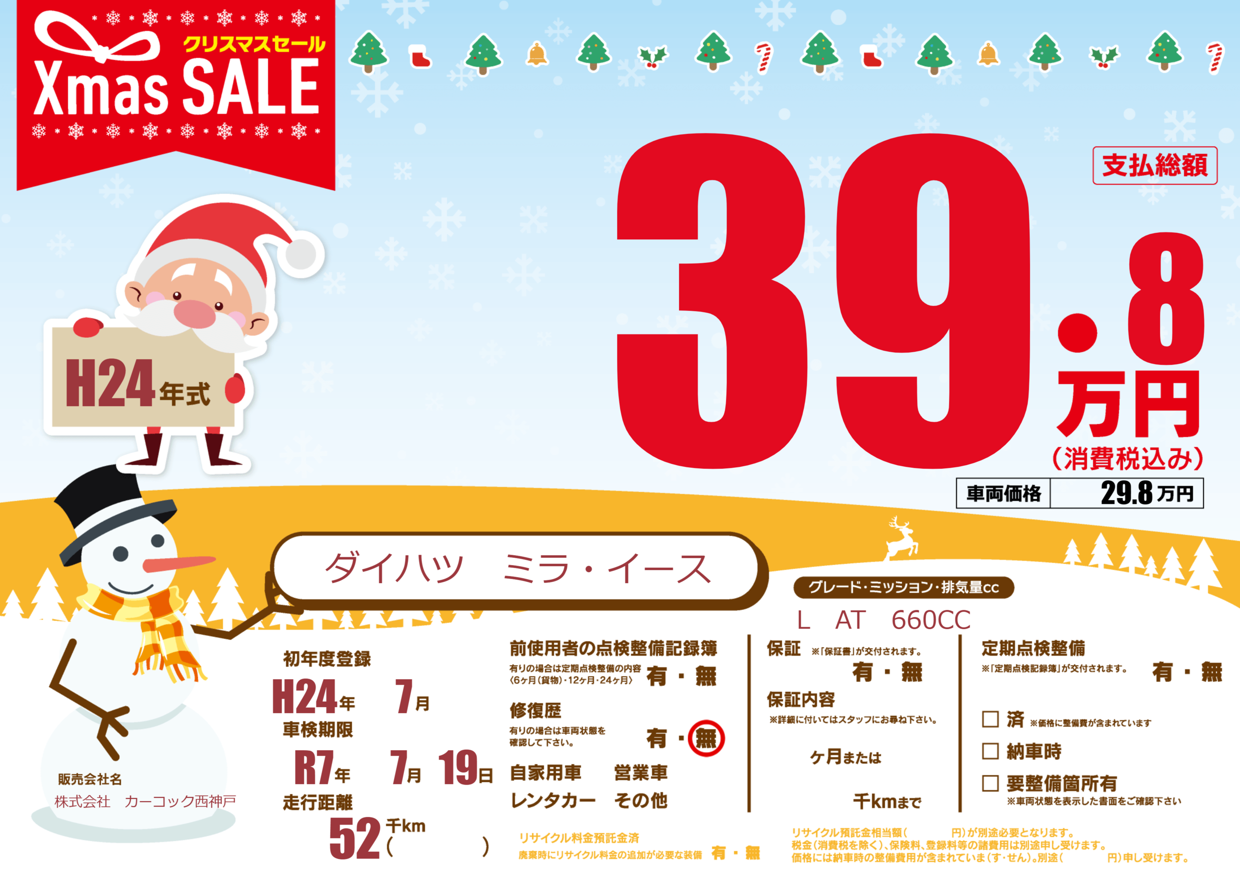| 車名 | ダイハツ ミラ・イース | グレード ミッション 排気量 |