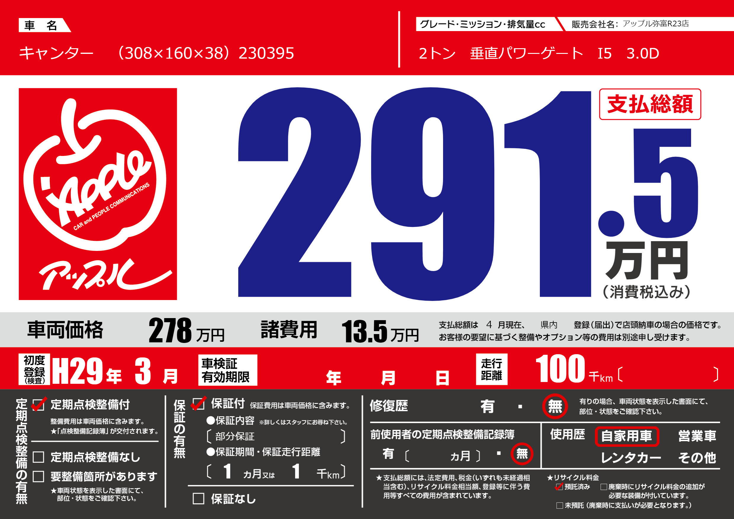 | 車名 | キャンター (308×160×38)230395 | グレード ミッション 排気量 |